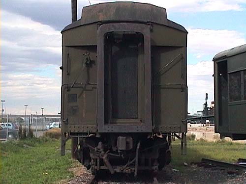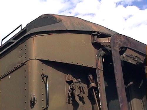 2両の保存車両の隙間に駅ホームが顔を覗かせる