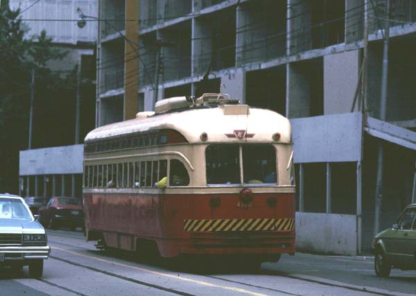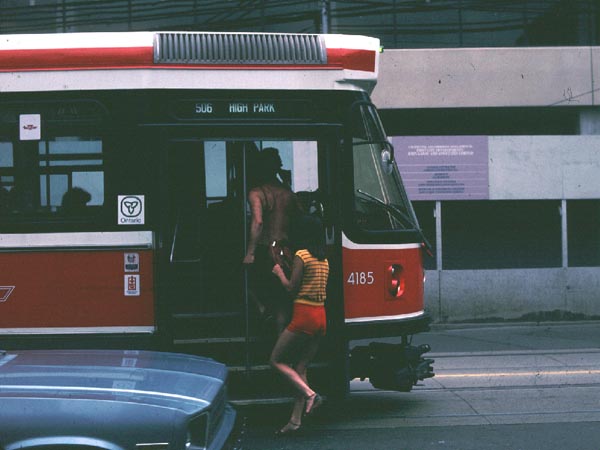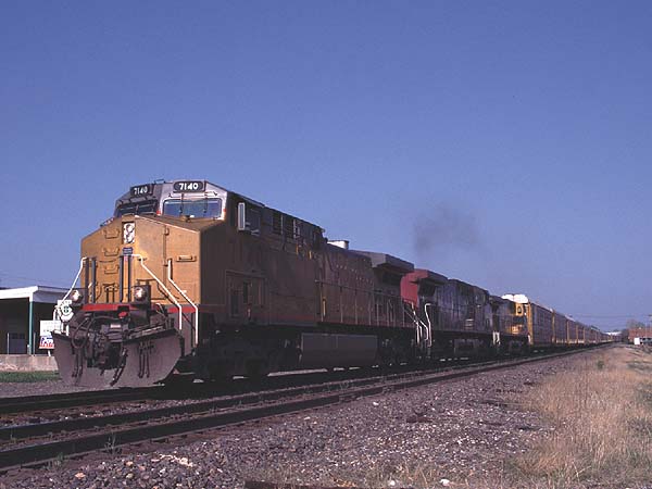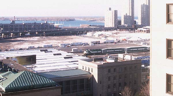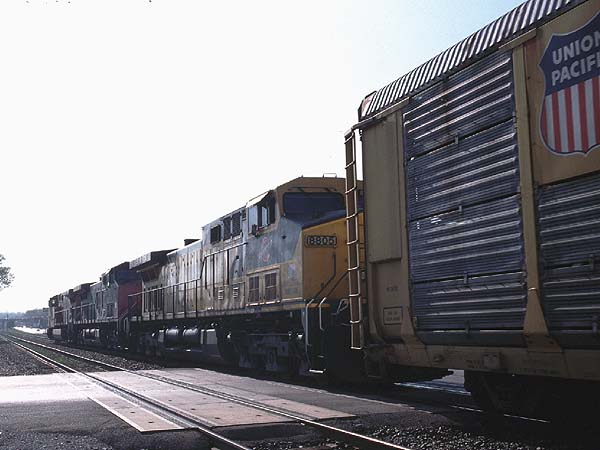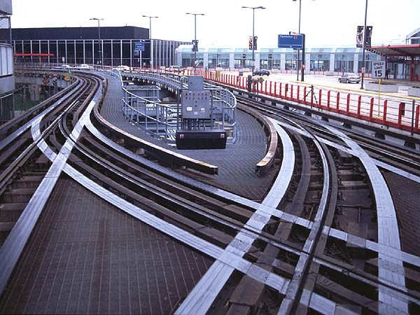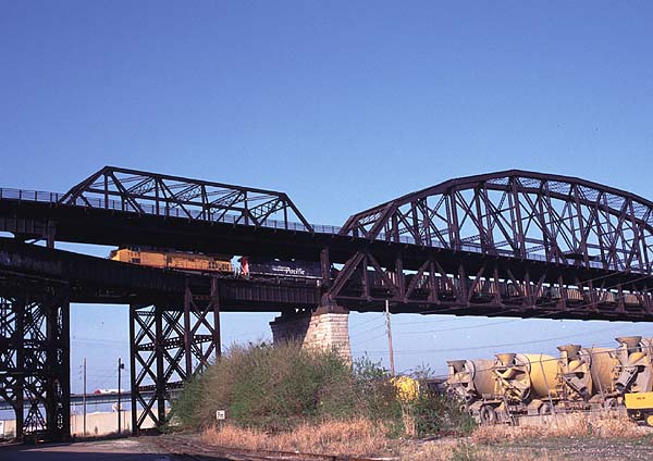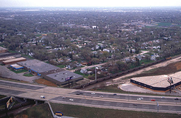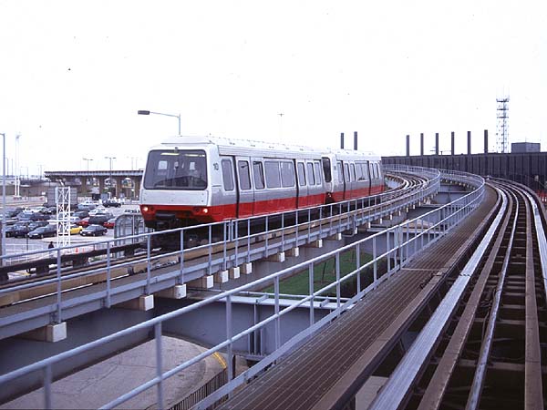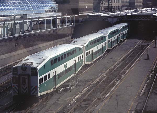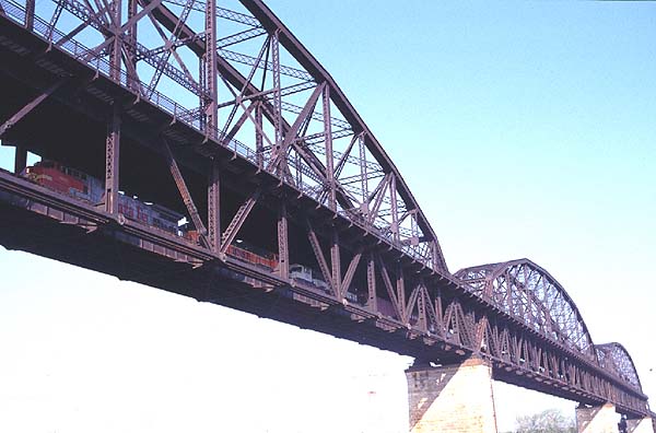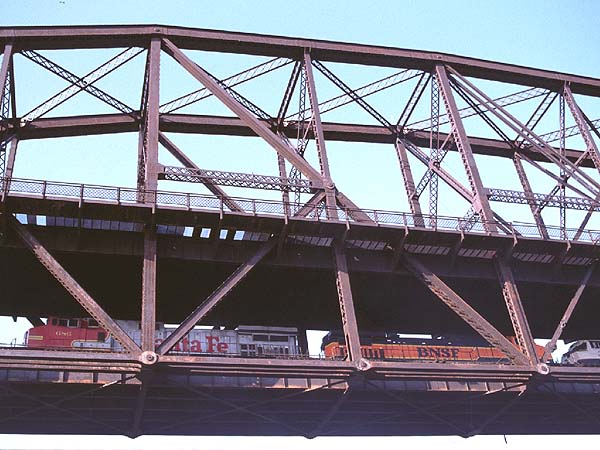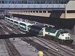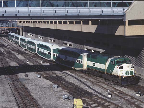 2000.4.8-4.17 (Ver.1, 2000.4.18編集) (Ver.2, 2000.5.28編集) (Ver.3, 2004.10.10編集) ![]() セントルイス・ミズーリ川の大鉄橋を行く重量貨物列車 Santa Fe + BNSF + BNSF塗装のDL三重連が牽引 (2000.04.15、セントルイスにて、Nikon New FM2, AF Nikkor 35mm f2D, RDPII, 南那 轟) カナダのトロントに5泊、アメリカ・ミズーリ州セントルイスに2泊、おなじくミズーリ州ローラ(セントルイスから160km)に1泊という行程で10日間旅をしました。鉄分は少なめで、トロントで地下鉄に乗ったのとGOトレインを駅の構外で撮ったこと、ローラで遠目に貨物列車を見たこと、それに、セントルイスの川岸で貨物を数本撮ったこと程度です。あと、うまく撮れたかどうかわかりませんが、空路乗り継いだシカゴで、着陸直前に大きな操車場の上を見ました。とっさに「空撮」しましたが、果たして出来はどうでしょうね。 トロント Toronto, ON, Canadaトロントではホテルの所在がユニオン駅(中央駅)を見下ろす絶好のロケーションだったにもかかわらず、駅のホームには乗客以外は入れないというポリシーに阻まれ、残念ながら駅撮りはできませんでした。駅構内のはずれに陸橋があり、そこからGOトレインを1本撮ったに留まりました。ホテルの部屋からは駅に出入りする列車が時折見えます。VIAのサインを付けたカナダ旅客鉄道の列車も遠目に見ました。市内には路面電車があり、中華街へ食事に行った時などによく見かけました。ですが、そういう時に限ってカメラを持ってないんですよね(^^; あとは、地下鉄に乗りました。VVVF駆動で銀色ボディでした。加速がよかったです。