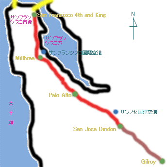 古くはサザンパシフィック鉄道(SP)が運営していたものを,1992年7月1日からPeninsula Corridor Joint Powers Board (JPB)が経営主体を引き継ぎました.2000年9月からは平日の日中は30分ヘッドで列車が運転されるようになり,利便性が向上しました.2001年10月現在,サンフランシスコ空港から,無料シャトル〜カルトレイン・Millbrae駅〜サンフランシスコ4th and King駅と移動するルートが最も経済的にサンフランシスコのダウンタウンに移動できる方法になっています.これは,サンフランシスコの湾岸高速鉄道というべきBay Area Rapid Transit, BARTが2002年にサンフランシスコ空港に乗り入れるまで続きます.