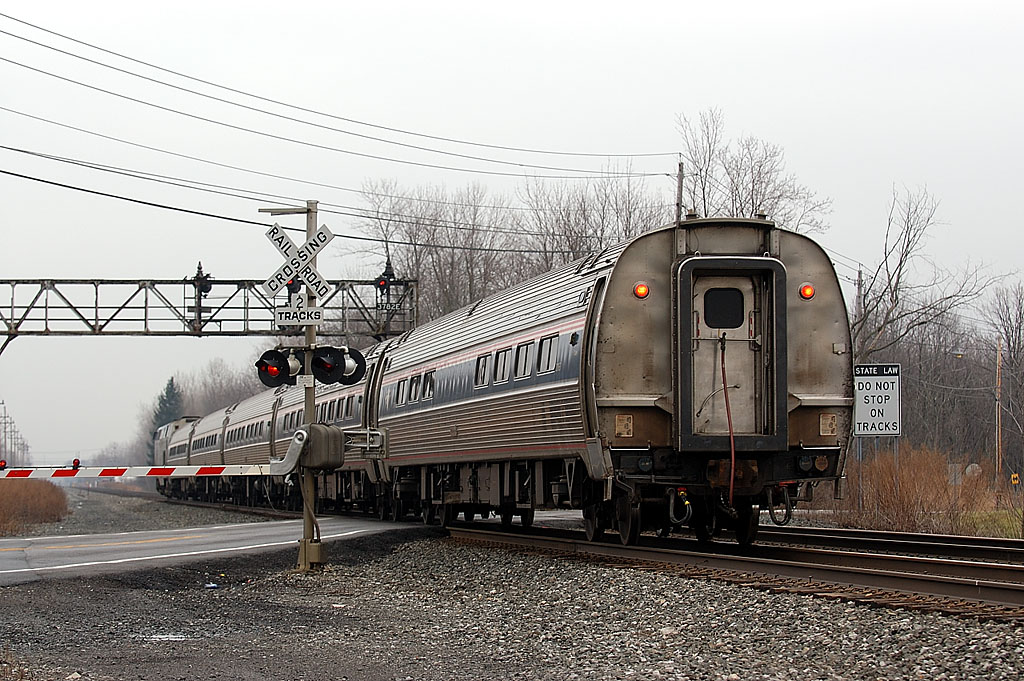 √390から複線の線路が見えたので、Chiliと書かれたExitでちょっと降りてみます。近くの踏切でクルマを停めてみると、東西に一直線の区間です。10分としないうちに、おーっ、東の彼方からヘッドライトが見えるではないですか。やったねぇ! 短くてがっかりでしたが、近づいてみれば何と旅客列車。あとで63 Maple Leaf, New York Penn Station(NYP) - Toronto(TWO)と知りました。