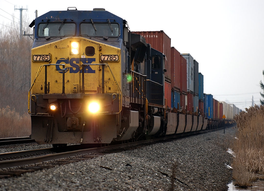 すぐに東からまた貨物列車がやってきました。アングルを変えて撮ってみます。7785はDash 8-40CWです。