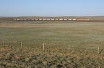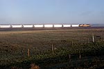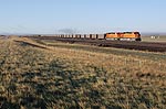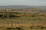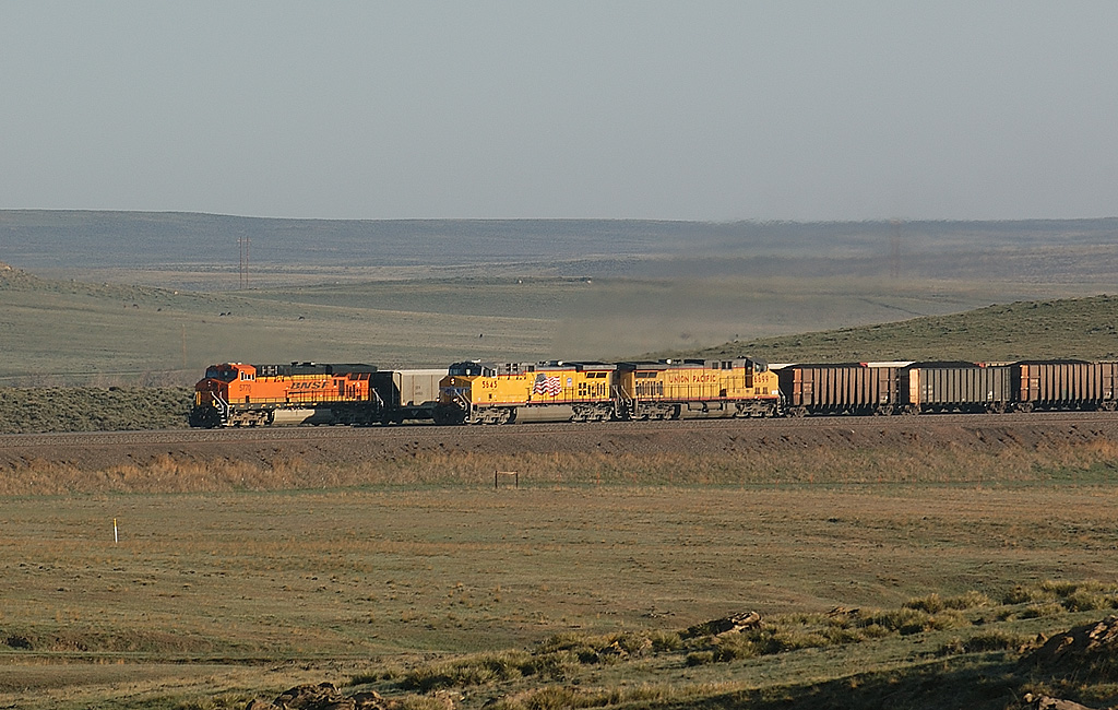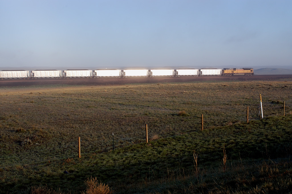そのオーバークロス上を何かがうごめいている.列車だ! フルコールが南に下っている.いいねぇ,こんなにも石炭輸送は活発なのか.トラックの下を通り抜けると59号は北に進路を取り,トラックと並走する.南下するフルコールの後尾に黄色いUPのヘルパーが見える.さぁはじめよう.クルマを停めて牧場越しに列車にカメラを向けると,ステンレス製の貨車が朝日にまぶしく輝いている.付けっぱなしの35mmレンズで狙う.午前は59号からトラックを臨む方向が順光だ.ヘルパーはUP8212号,SD9043ACだ.でかい.