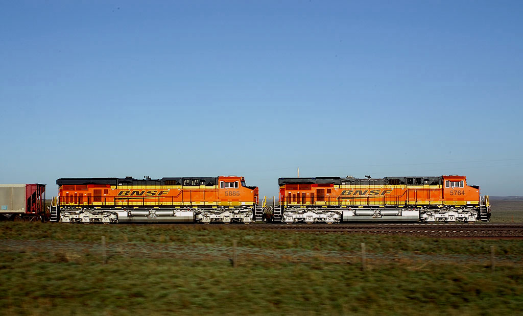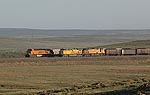 次の瞬間,その陰からBNSFの列車が踊りだしてきた.パワーバー塗装のES44AC重連がエンプティコールを牽いて北へ快走している.UP機との離合を撮り,BNSF列車の単独写真を撮り,急ぎクルマを走らせる.30秒としないうちによいサイドビューを狙える場所があったのですぐクルマを停めてワンカット.すぐ走り始めると,3分ほどで今度は姿写真によい場所に遭遇した.またクルマを停めて2カットを撮って走ると,今度は列車と並走だ.朝日に真新しいボディが輝き,美しい.みずみずしいパウダーリバーの朝が気持ちをいっそう高揚させてくれる.霧はすっかり晴れ,昨日と同じパウダーリバーの青空が戻っている.さらに姿写真を一度押さえると,道路はいくぶん列車から離れた.