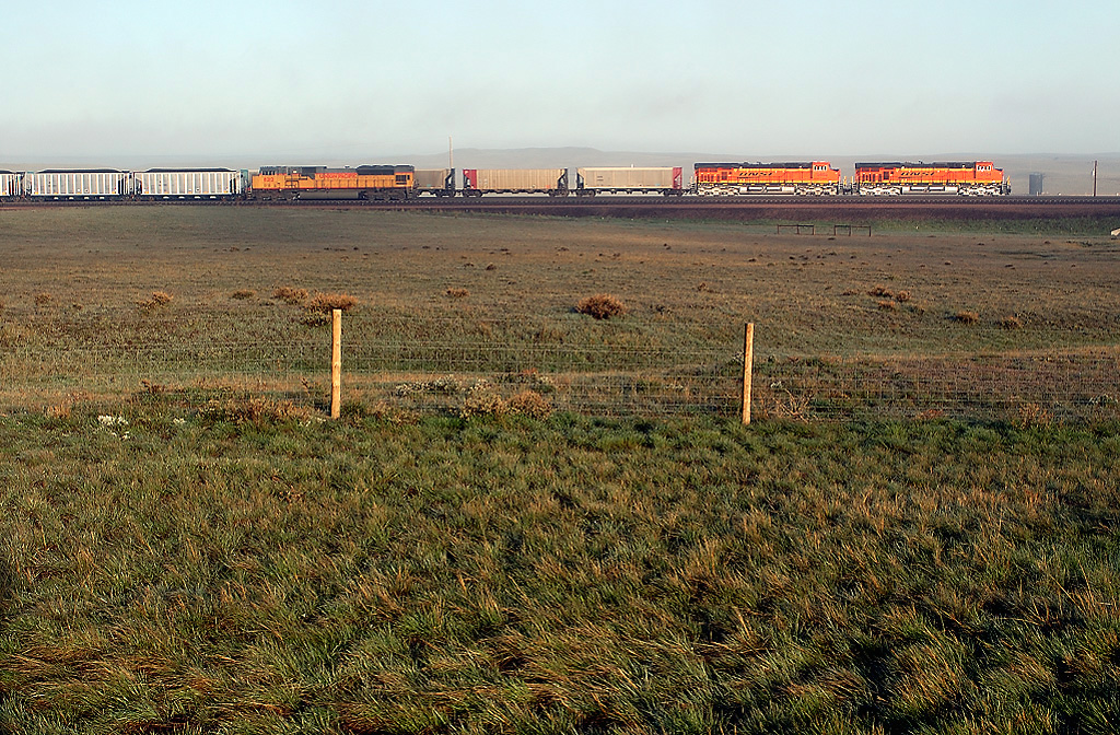 すがすがしい朝の原野で行き交うBNSFとUP