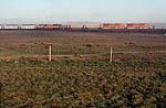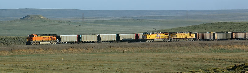 原野の中央で出会った2列車。UPはリードユニット、BNSFはDPUだ。 |