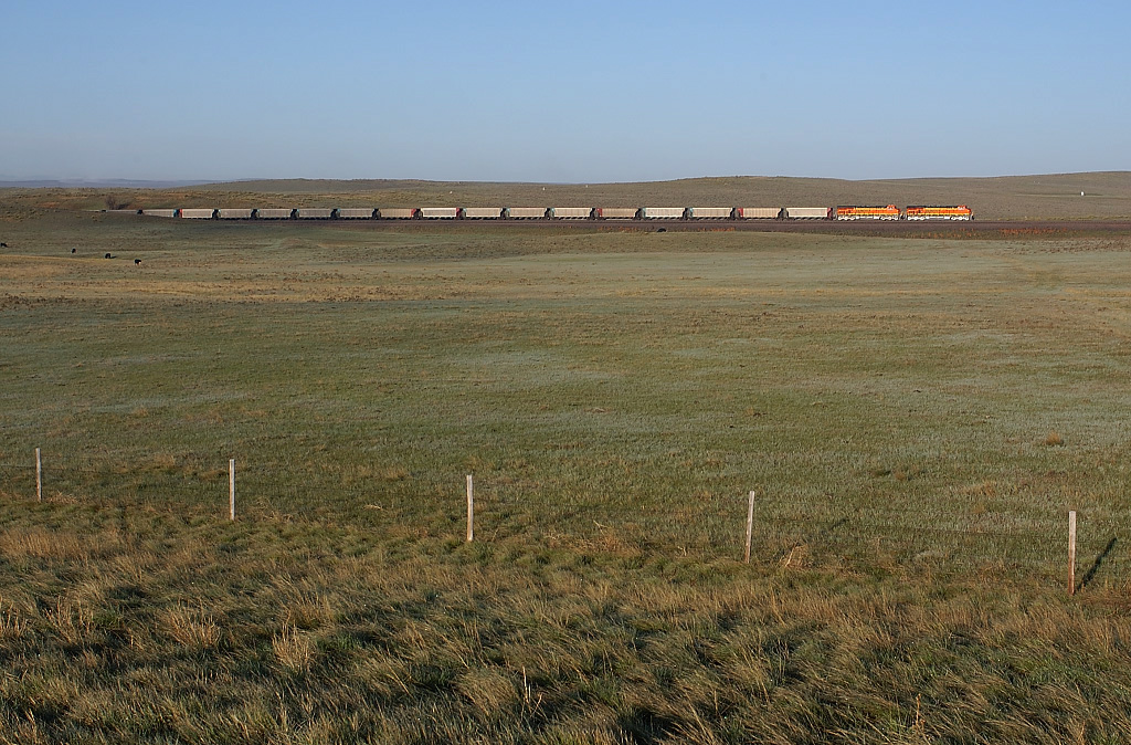 牧場の向こうに朝陽に輝く新車のES44ACが行く。手前の牧草にみえる影が早朝の雰囲気を伝えている。 |