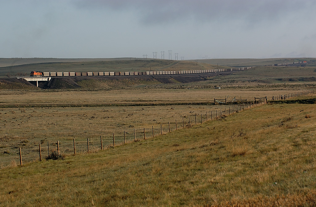 3分半後,やや遠くサイドから列車を望める場所に出た. ES44AC重連を撮り,列車の進行方向に目をやると,UPのフルコールがヤマを降りてくるのが見えた.レンズを望遠ズームに換え,離合シーンを狙う.そのファインダーの中に橋梁が見える.昨日訪れたハイランドループロードはこのあたりなのだ.起伏に富んだ丘陵地帯の向こうにパウダーリバーの平原が広がる.雄大だ.