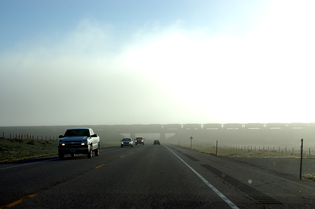 翌朝は6時半スタート.すごい霧で視界がほとんどきかない.ホテルの隣のガソリンスタンドすら霞んで見える.霧の森と化した59号をそろそろと北に向かうこと15分,森が途切れると霧は少しづつ晴れてきた,ほどなく遠くにOrin Lineのオーバークロスが見えてきた.視界はかなりきくぞ.