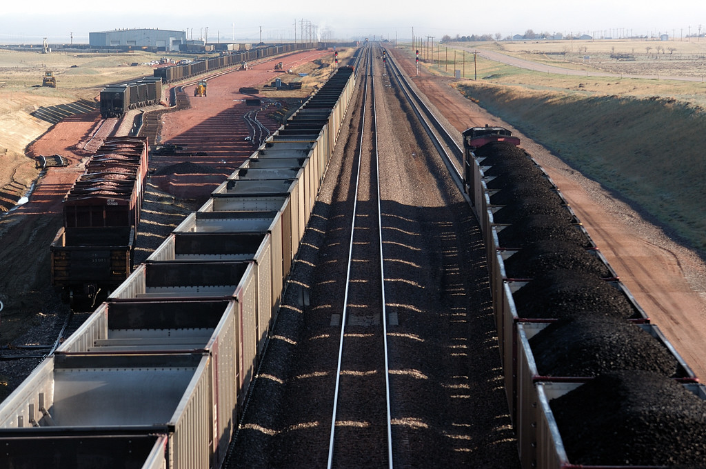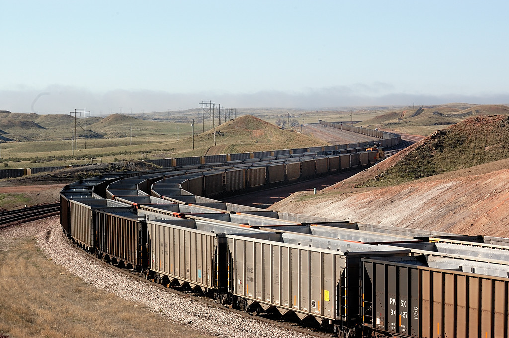 Antelope Coal Mineで石炭の積出線に待機する列車群。後尾にBNSFのヘルパーを付けた編成も見える。