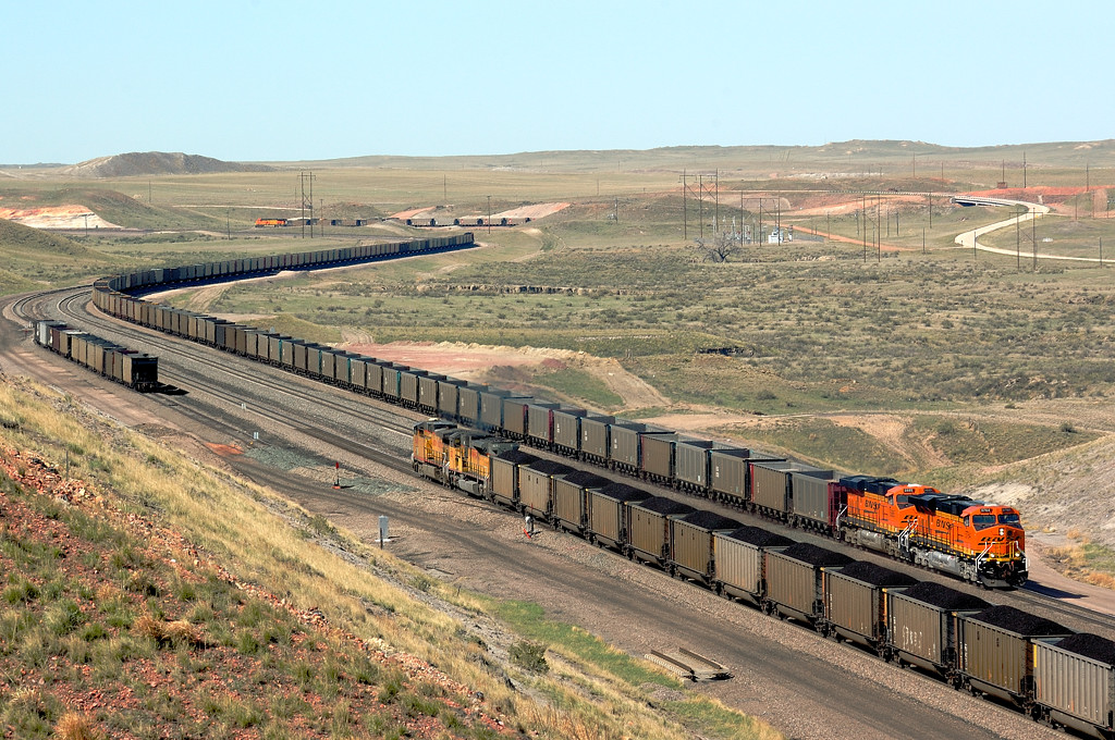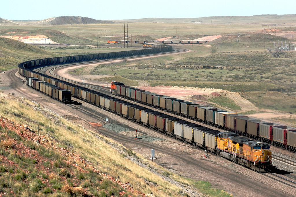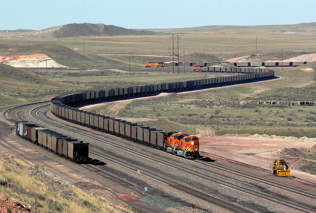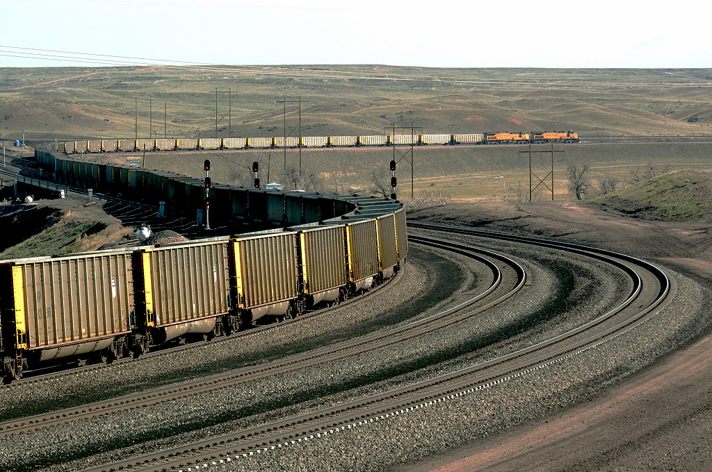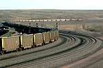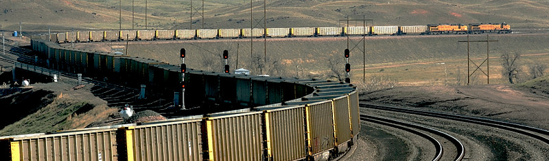 そこへ、ヤマから下るUPフルコールが交換する。1枚の写真に3本もの石炭列車が入っている。これぞパウダーリバーの迫力。RailPictures.net掲載 |
