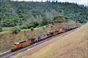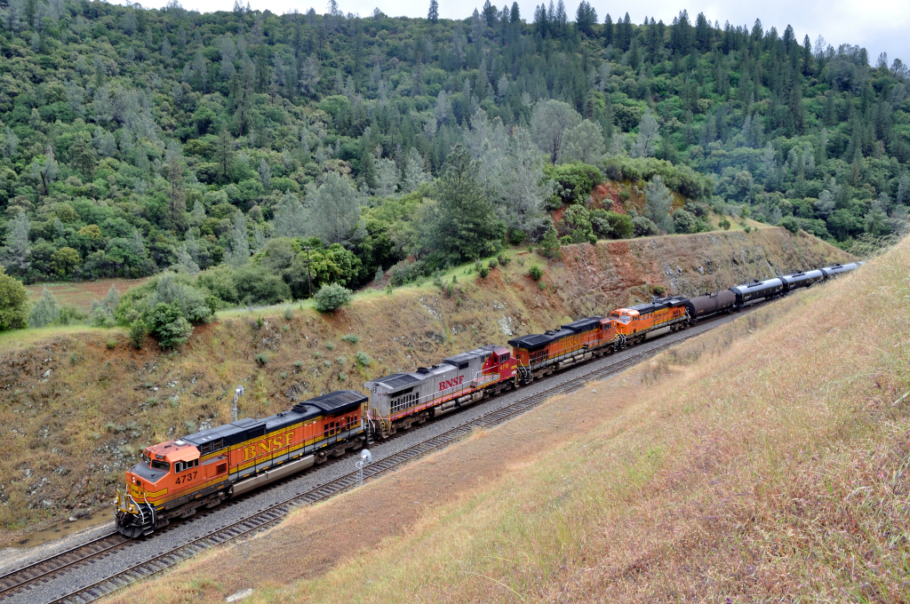 NEWオロビル(Oroville)市街から約15分、ジェームズ(James)のホースシューカーブを過ぎた。列車は見えないけど、CA-70のすぐ下がジェームズ駅のはずだ。クルマを止めて、その方へ歩くと、居た居た! 東行きのBNSFが停まってる。嬉しさがこみ上げる。前から順にBNSF 4737(C44-9W), 4740(C44-9W), 5120(C44-9W), 7439(ES44DC)。2両目の4740の塗装はワーボネットで目を惹きます。さぁ、先回りしよう。 |