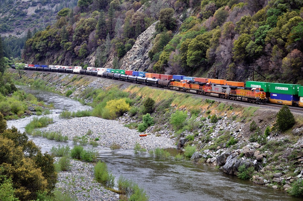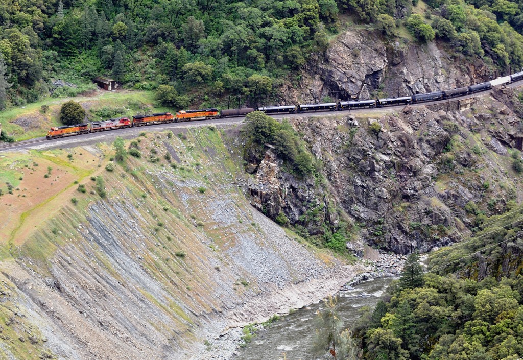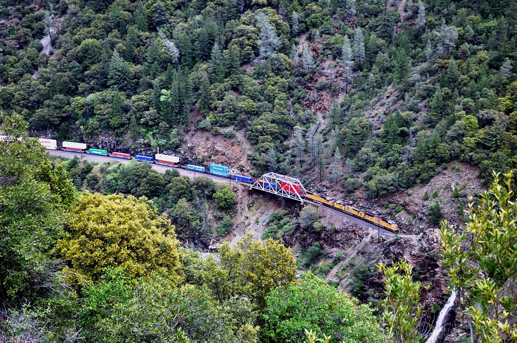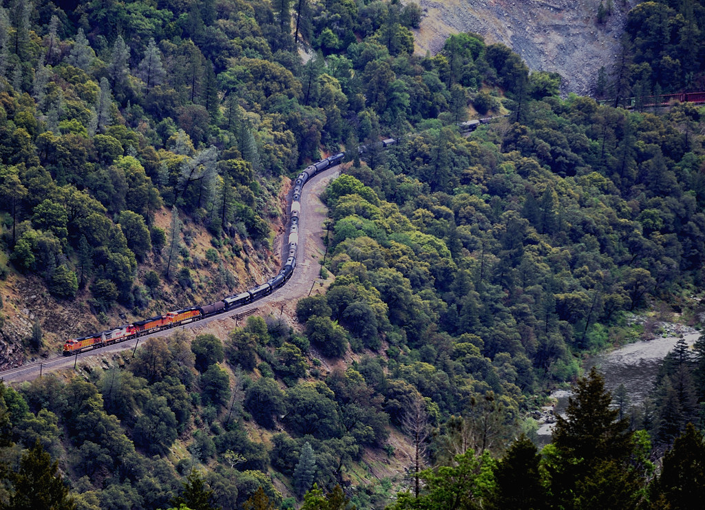 Sカーブを切ってオロビルへと下ってゆく。 時計を見ると、最初にジェームズでBNSFマニフェストを見つけてからもう2時間経っている。列車本数はわずか2本だが、計10カット以上の峡谷シーンを撮影できた。満足して峡谷の静けさにしばし耳を傾ける。 |