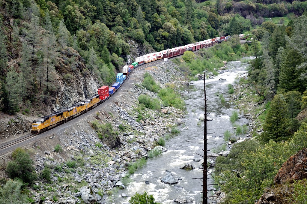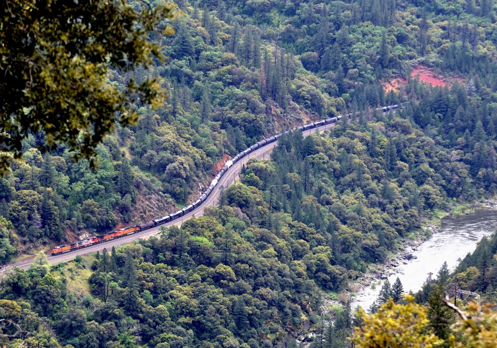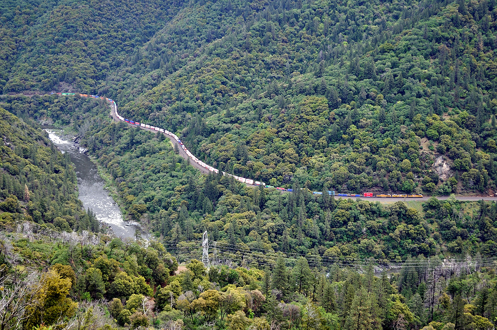 3. 午後の渓谷 数か月後、フェザーリバー峡谷を再訪する機会に恵まれた。昼過ぎにサクラメントに着き、14時頃フェザーリバー峡谷の入口にあたるジェームズ(James)で東行き列車を発見!工事列車ではなく通常のマニフェストです。撮影スポット、ポー(Poe)の西側で峡谷越しにカメラを構えます。 |