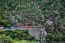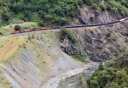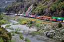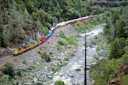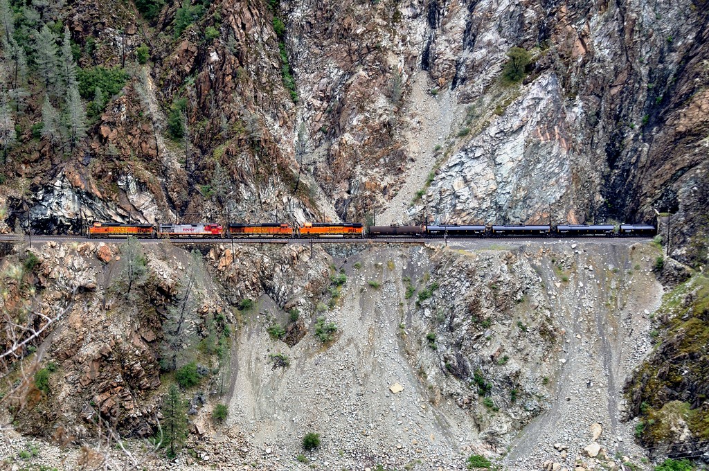 トンネルNo.2をp抜けると断崖絶壁の岩肌が迫る。この位置だと機号が読みやすい。改めて記せば4373, 4710, 5120, 7438の順で、いずれもGE製。前3両はDash 9-44CW、4両目はES44DCだ。2両目のワーボネットがやはり目を惹く。 |