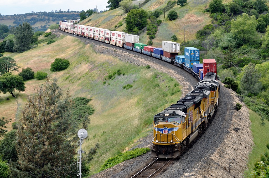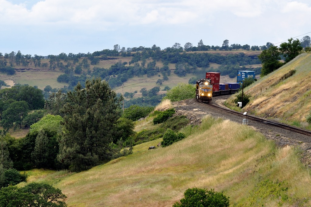 UPダブルスタックがプルガを発車する。機関車は4748(SD70M), 8357(SD70ACe), 4569(SD70M)の三重連。EMD製で固めており先のBNSFがGEばかりだったのと好対照だ。右後方に先ほどまで追跡していたBNSFマニフェストが見える。 |