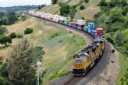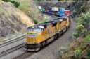 更にプルガ(Pulga)に先回りすると、対向列車と思しきダブルスタックが停車中だ。その脇をゆっくりとBNSFのマニフェストが進む。Jamesでこの列車を見つけてからもう1時間経過している。最後部が側線に入ると停車し、代わってUPダブルスタックが発車した。こちらに撮影ターゲットを移そう。 |