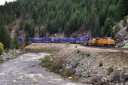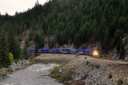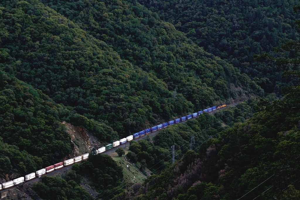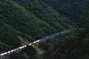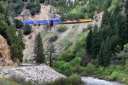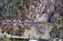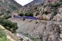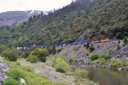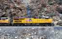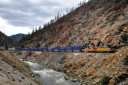 対岸の断崖を縫うようにゆっくりと列車が谷を下る。速度は遅く大きな唸りを上げている。場所はパックストン(Paxton)とベルデン(Belden)の間と思われるが、標識が少なく、よくわからない。 |