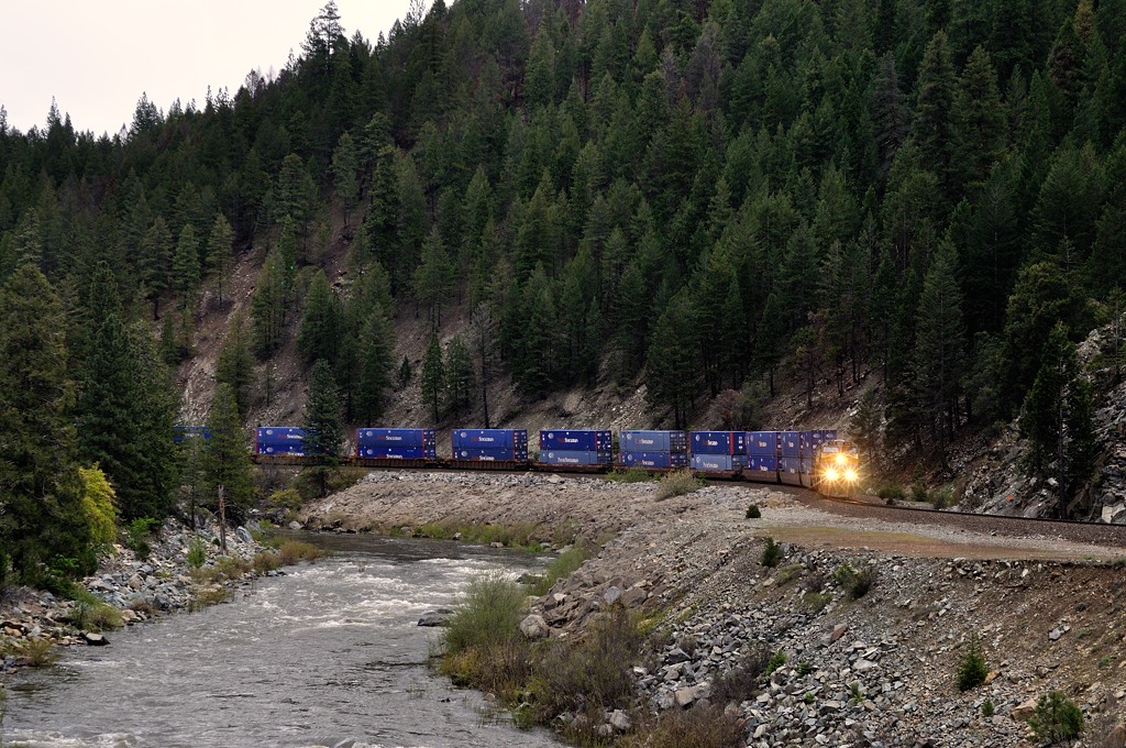 コンテナの統一された青色が、川面の白と、森の緑とよいコントラストを成す。晴れて欲しかったなぁ。 |