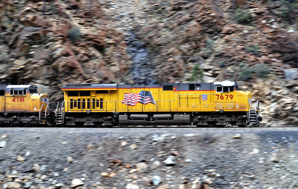 先頭は7679(ES44AC),次位は4781(SD70M)。GEとEMDとが手を取り合って進む。 |