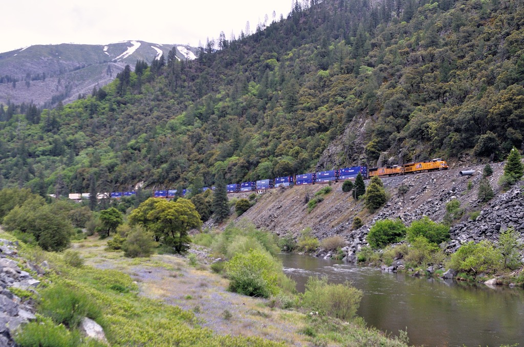 列車は残雪の頂をバックに進む。フェザーリバー峡谷は険しい山道とはいえ、5月に入って雪を頂くのは遠方の高山だけ。 |