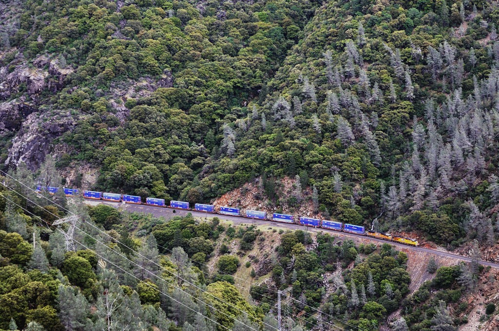 その先、ポーからジェームズの間では、CA-70とフェザーリバーは谷を隔てて別々の道を辿る。CA-90からは夕暮れの雄大な平原を望むことができた。明日も列車に恵まれることを期待しつつ、ホテルに向かった。 |