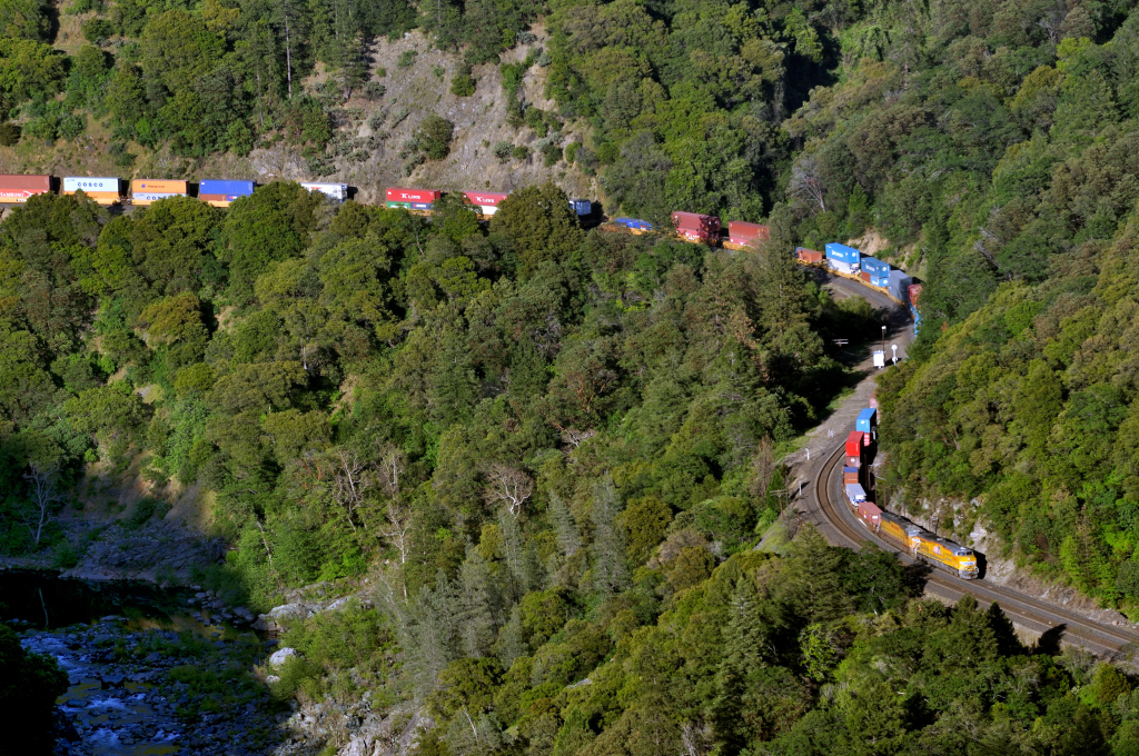 Poeの北東端に移動すると、UP7368(AC45CCTE)を先頭にした重連が良い光を浴びている。これもUP。 |