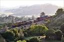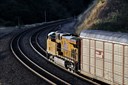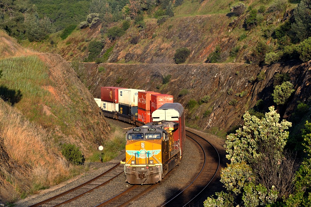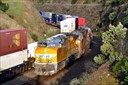 5分後、東行きが夕陽を受けてJamesから峡谷に向かっていった。UP7368のエンブレムが輝く。 |