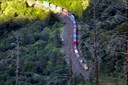さらに7368をホースシューカーブの出口で撮る。完全に逆光だが、意外に列車の存在感がある。 |
