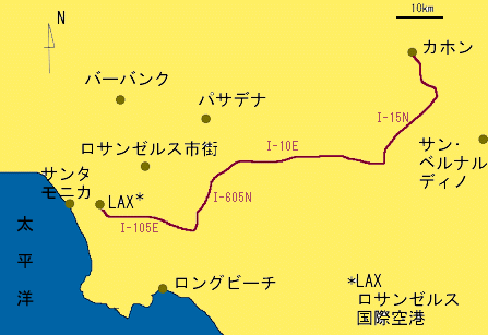 ドライブをはじめたのは11:20だった.クルマはフォードの小型車.10分ほど遠回りをしてしまったが,無事,予定したフリーウェイ105号に乗った.アメリカのドライブガイドのホームページを真似て,以下I-105
