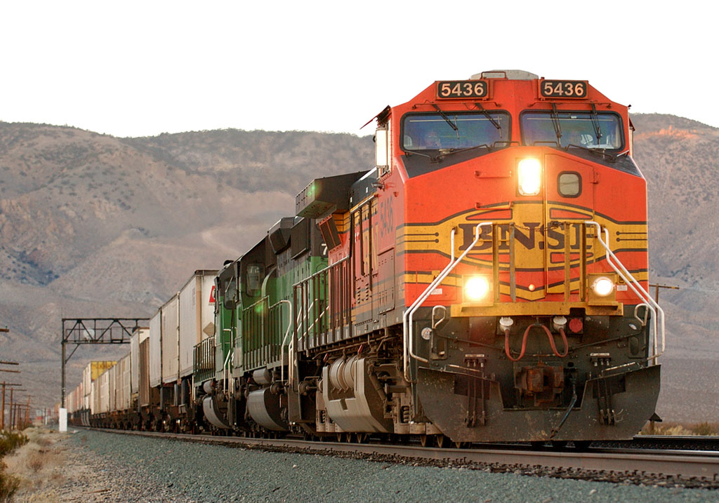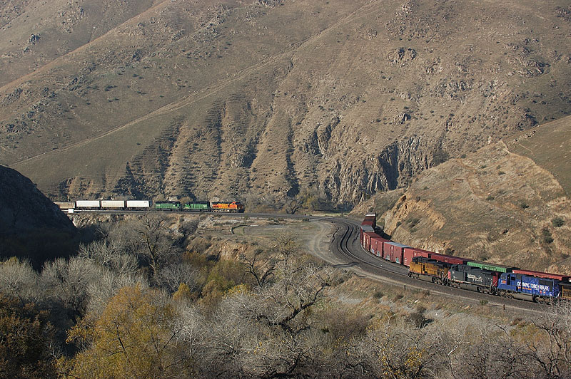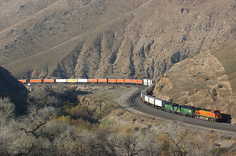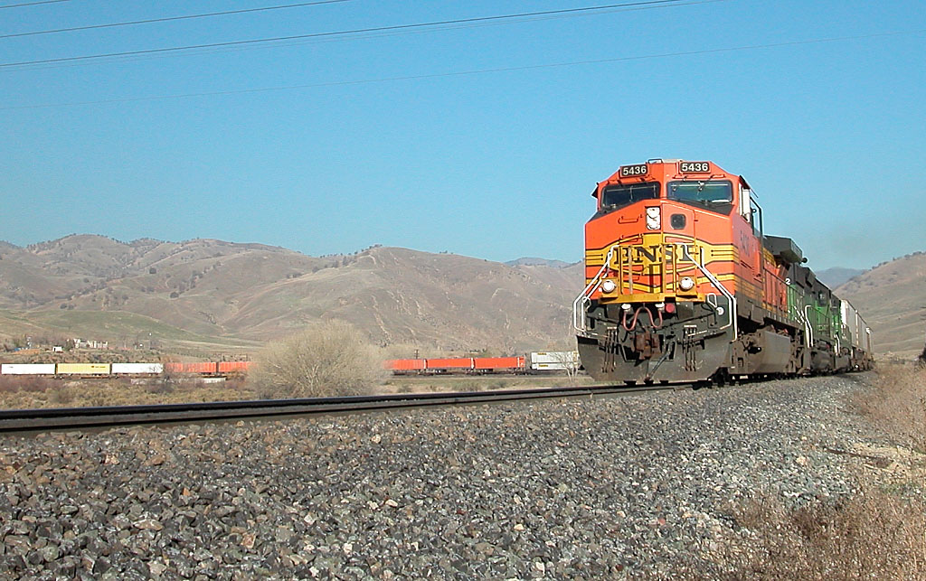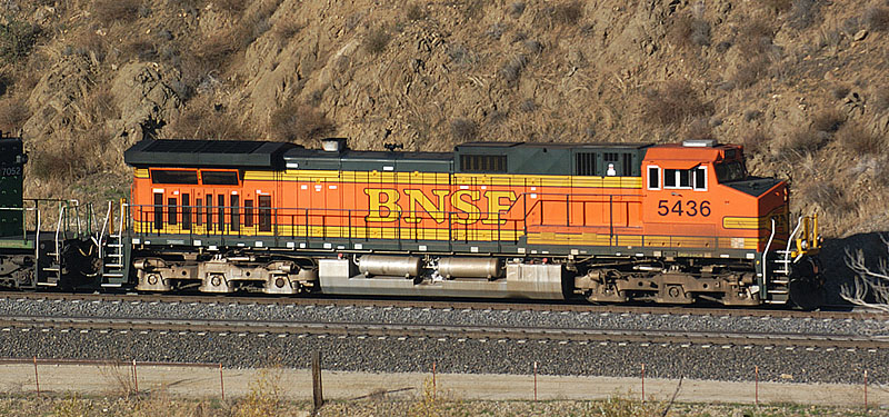 眼下に列車が迫ります.まず先頭はBNSF 5436, ヘリテイジII塗装のC44-9Wです.
