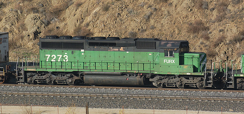 3両目はFURX 7273.これも旧BN塗装のSD40-2(1980.3製造)です.FURXはFirst Union Railのこと.