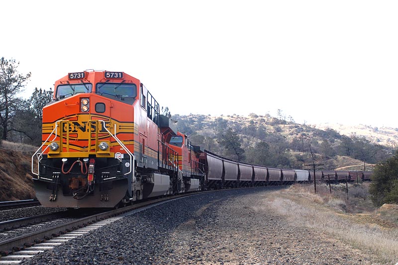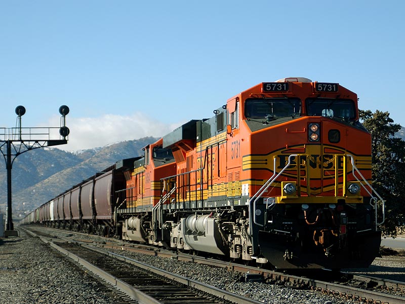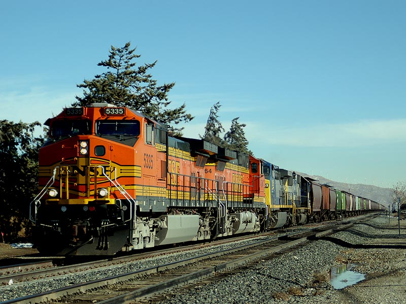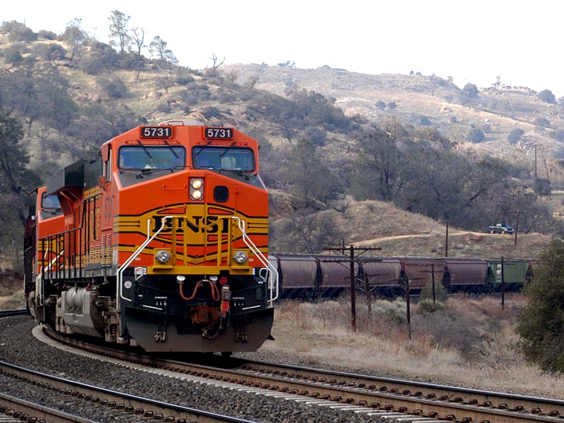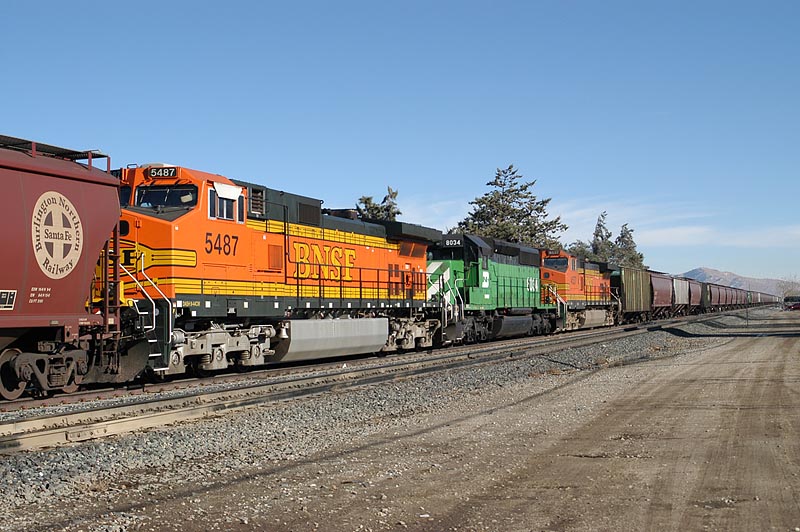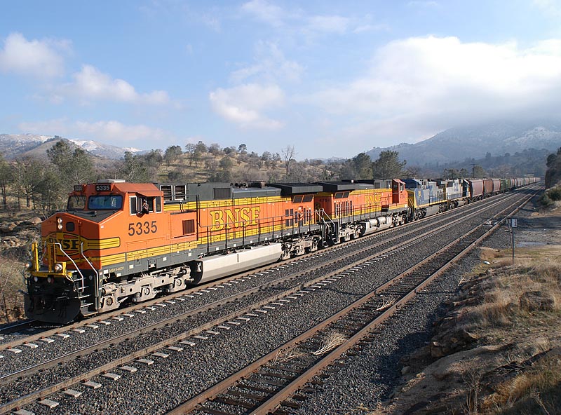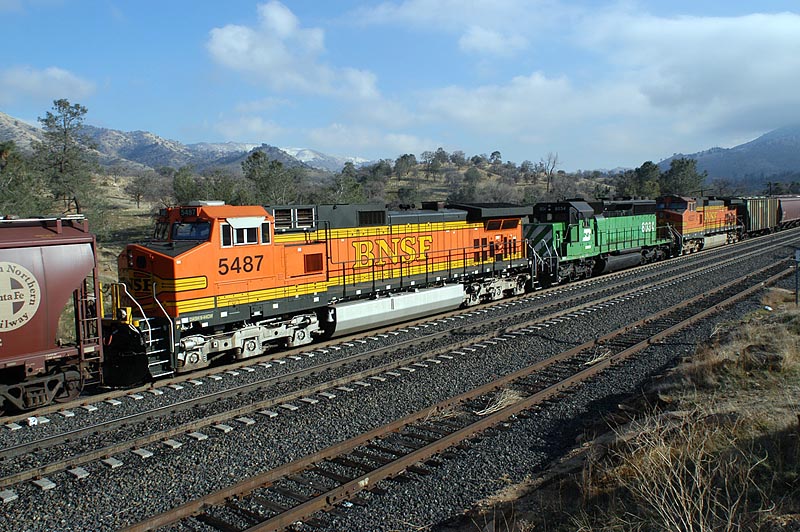 〜 真新しいAC4400CW TIER 2 GEVOに遭遇〜 Part I 今回の旅行で最初に出会った列車は,テハチャピ駅で見た4重連+中間3重連+後尾重連でした.掲示板で次のように速報でお知らせした列車です. 68. テハチャピjにて 南那 轟 [URL] 2004/01/05 (月) 14:26 天気は晴れたり曇ったりでしたが,まずまずでした.2枚だけですが,どうぞご覧下さい.この列車の最後尾のユニット5731はAC4400の改良型で,AC4400CW TIER 2 GEVOと呼ばれるようです.詳しいことはわからないのですが,Webにthe new GE Evolution Series 12 cylinder prime mover, nicknamed GEVO" という写真説明がありました.GEVO=Ge EVOlutionなのでしょうね.ご存知の方がいらっしゃいましたら,是非ご教示ください. この列車をTehachapiからCalienteまで追いかけましたので,2つのページに分けてご紹介します. ![]() 冒頭に記した掲示板速報でご覧頂いた画像です.テハチャピ駅構内の踏切から撮影しました. 列車到来の30分ほど前に,Summit Switchで会った現地のファンの方から,まもなく4重連+中間ヘルパー+後部ヘルパー という構成の西行き(Westbound)がやってくると教えてもらい,撮影することが出来ました. ![]() その中間へルパーです.実は,列車の中間にヘルパーが入る列車を見るのははじめてで,昂奮しました. ![]() 軽い気持ちで撮影した後部ヘルパー重連.正直に申し上げますが,この時点ではC449WとAC4400の区別も付きませんでした. 猫に小判ですね〜. ![]() Woodfordにて. かの有名なTehachapi Loopでこの列車を撮影しようとクルマを走らせたら,途中Woodfordでこの列車のことを教えてくれた 現地ファンに出会いました.で,一緒に撮影.高い山は雪化粧しています.一昨日強い寒波が到来しています. ![]() 中間ヘルパーが目前に迫るころには列車は減速し,そのまま停車しました.ブレーキ音の迫力がすごいです. 交換か追い抜きがあると読んで,すぐループに行きました.やってきたのはUP東行きインターモーダルでした. そのご紹介はまた改めて・・・ ![]() ループからWoodford戻ると,列車はまだ停車していました.曇ってしまいましたが,後部ヘルパーをここでも撮影しておきました. ![]() 停車中なので,アングルは自在です(^^; このあとBealvilleに向かいます→Part IIへ(未了) |