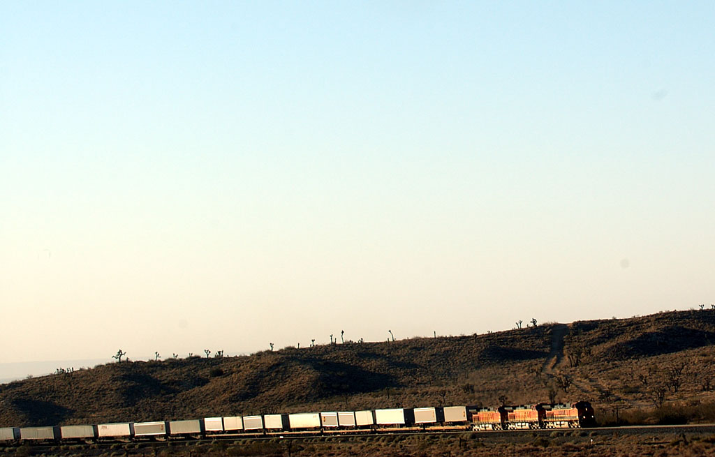 | 実は,その数分前に西行きのピギーバックが峠を目指して行くのを見ました.クルマを急停車させて撮ったのがこの画像です.場所は58号が14号に合流する地点です.すぐ上の東行きを撮ったあと,この西行きを追うことにしました. Mojave-Cameron, 7:06 |