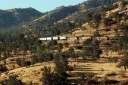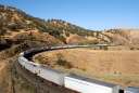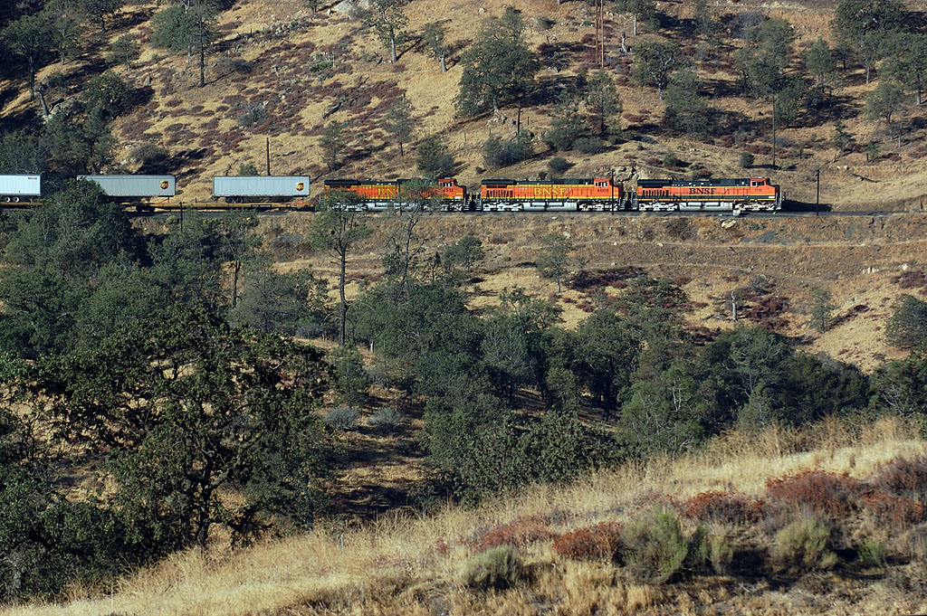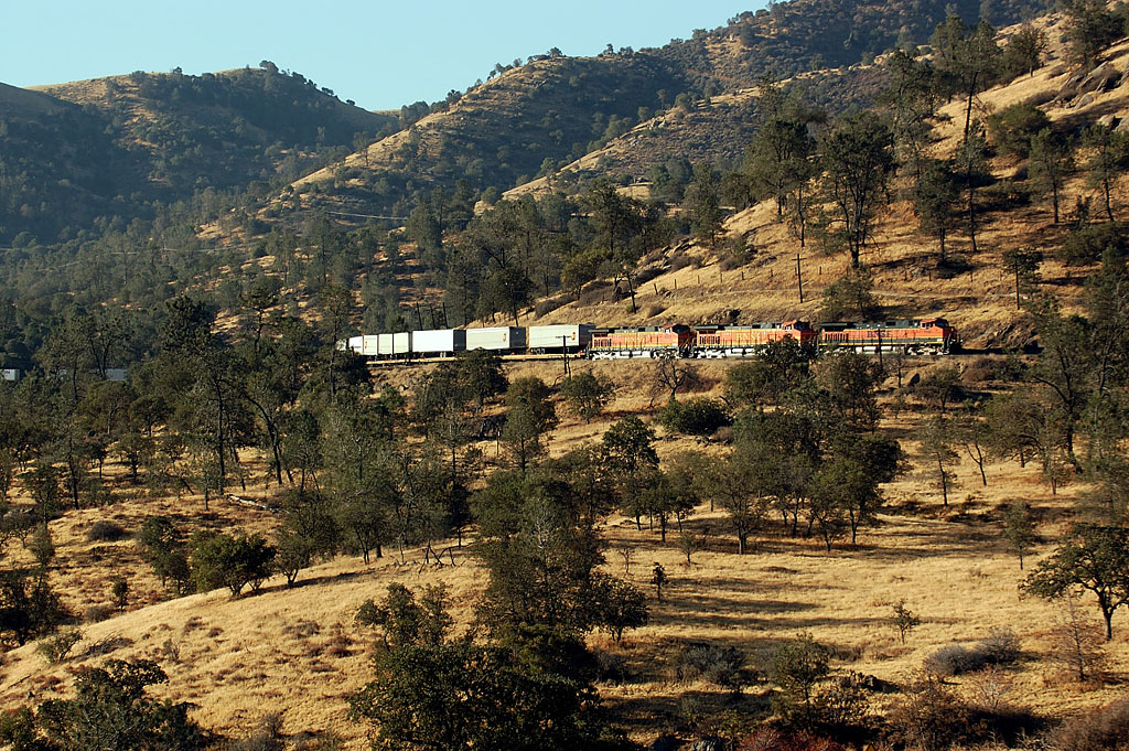 | Tehachapi市街でこの西行きに追いつきました.列車の北東側から陽が射しているのに気づいたので,ループ手前のMarcelで58号を降りました.その近くから,フリーウェイ越しにループに駆け上がる列車を狙いました.このサイドに陽が当たるのは午前の早い時間だけです.木々の隙間に列車が見えはじめてから3分後,やっとここまで来ました. Marcel-Walong (Marcelの構内外れ), 7:48 |