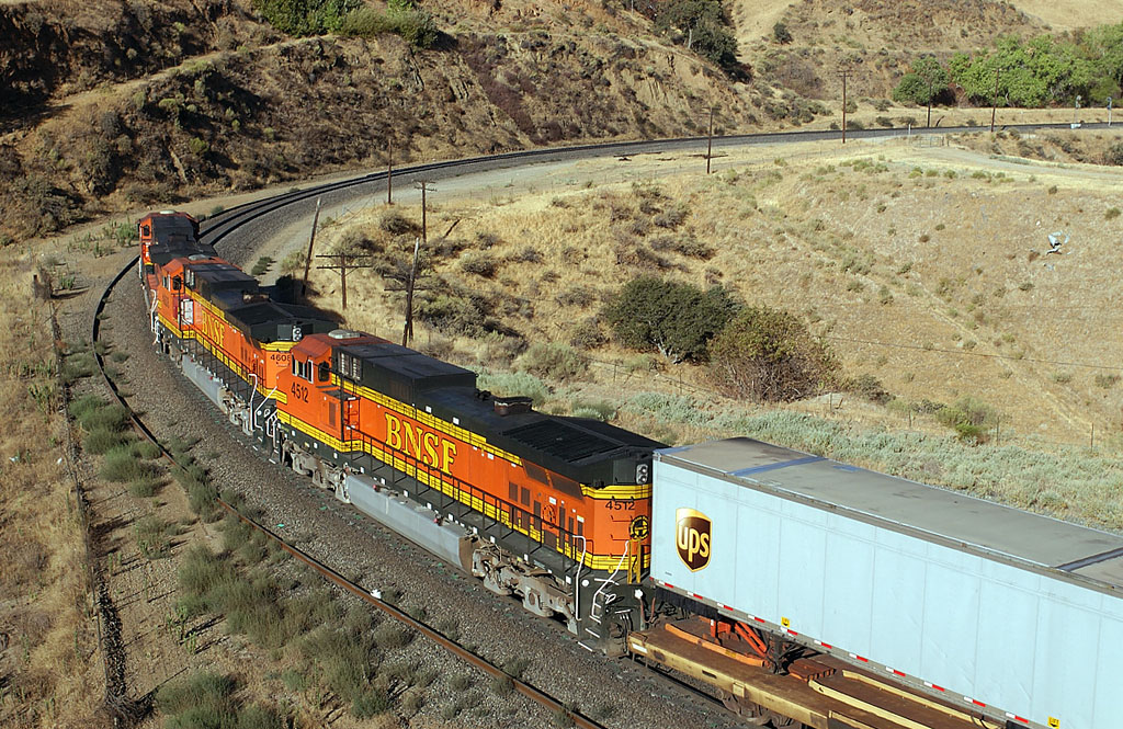 | 朝日にサイドがギラリと輝く.荷のピギーバックにはUPSの文字が見えます.どうも優先度の高い列車のようです.また,ここへ来てようやくロードナンバーが読めました. Marcel-Walong 7:50, BNSF 1116+4608+4512(すべてC44-9W) |