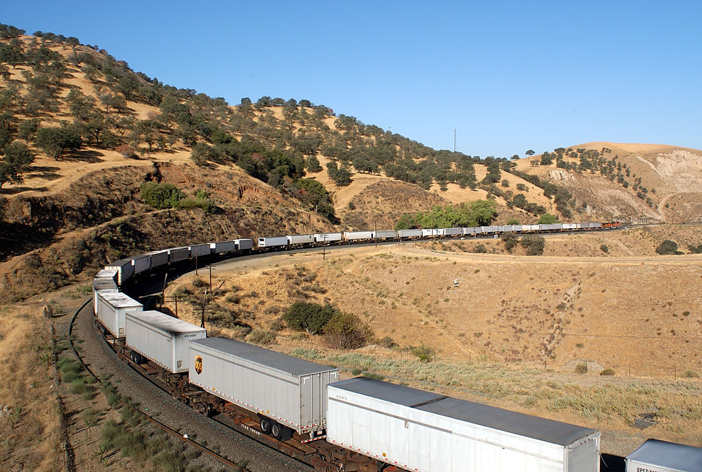 | ここはダイナミックなHorse Shoeカーブです.ずらりと並ぶUPSのピギーバックが壮観ですね.この列車とはここでサヨナラです. Cliff-Bealville, 8:19 |