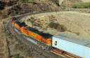 | 列車はループを越え,CliffからBealvilleへ下ります.Marcelからここまで30分も掛からずに到達するとは早いですねぇ.ここは駅のほぼ中間地点.ブレーキ音を軋ませながら,列車はゆっくりと走ってゆきます. Cliff-Bealville, 8:18, BNSF 1116+4608+4512(すべてC44-9W) |