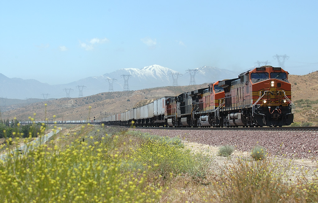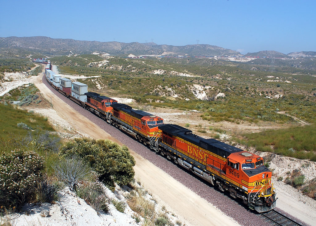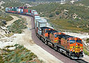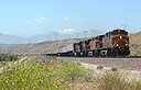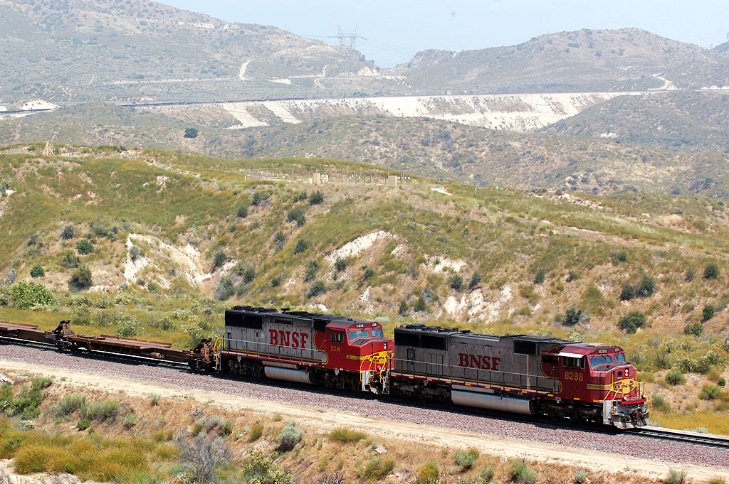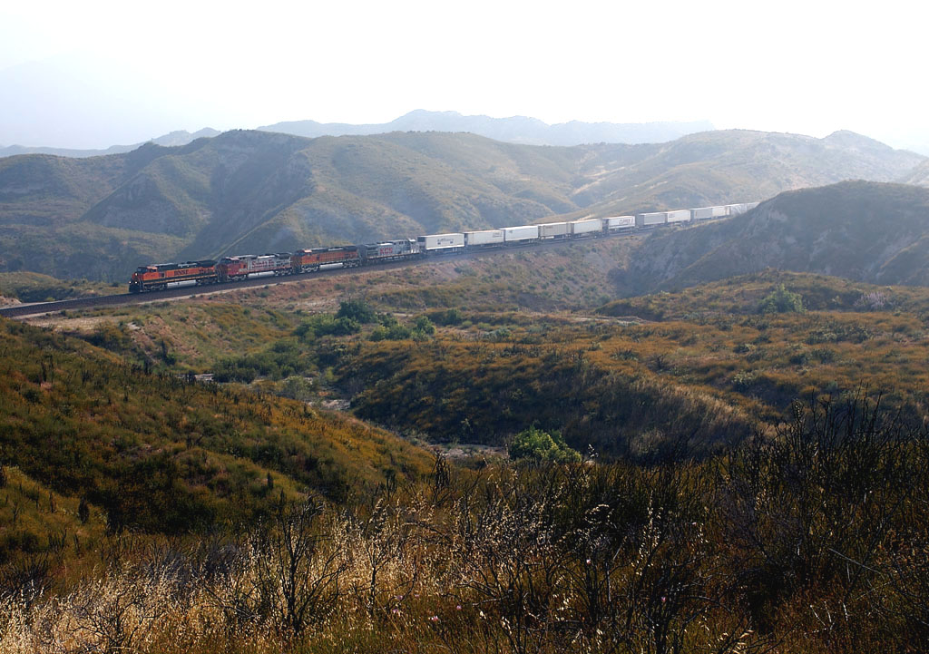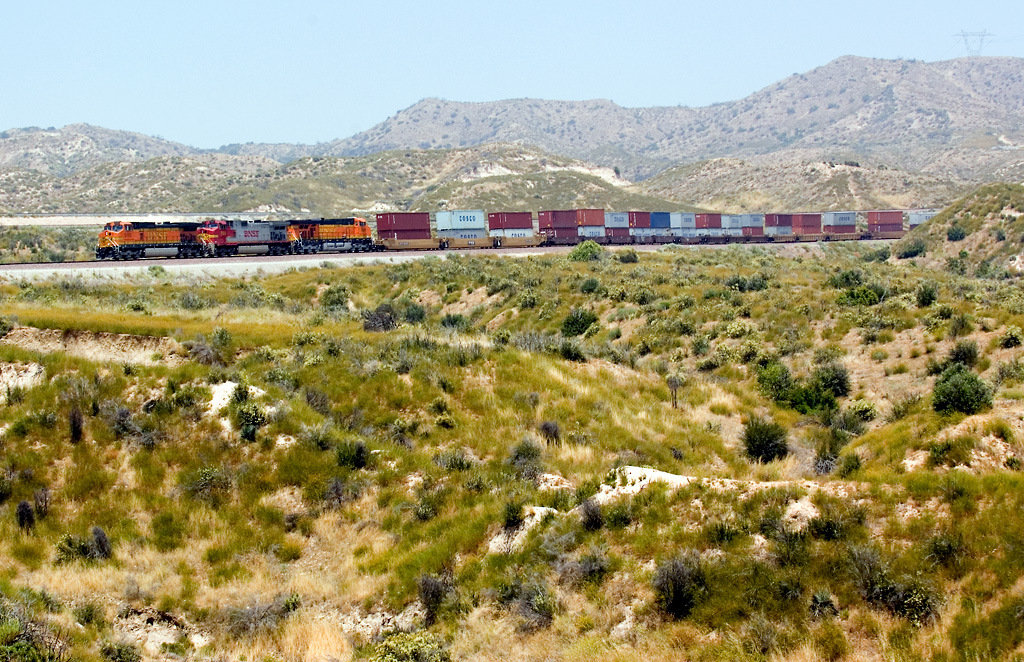 | 2005年のCajon訪問では、事前にドローバーフラッツ〜トンネル〜サミット手前と,ルーゴからヘスペリアへのカーブ連続区間を主体に考えていました。LAX(空港)からCajon Junctionまではずっと曇天でしたが,峠は終日晴れました.6月の強い陽射しが,終日峠を行き交う重量級列車にふりそそいでいました.BNSF機やUP機ばかりでなく、NS, CN, KCS, EMD塗装機なども峠を越えていました. ES44DC がBNSFにリリースされ,一部に塗装がこれまでのヘリテイジ塗装とは少し違った車両があり驚きました.BNSFロゴが斜体字に変更され,そのロゴの下に斜線が1本入っています.正面もほぼ同様の変化内容です.ざっと画像を見たところ,ロードナンバー7753, 7704(従来ロゴ), 7752, 7743, 7695が確認できました.その後この塗装をHeritage 3(H3)塗装と呼ぶことを知りました。帰国後、山本喜一さんから、H3塗装はES44DC/AC用に作られたのではなく社名がBNSF (Birlington Northern Santa Fe Railway)からBNSF(BNSF Railway)に変更になったためだと伺いました。 撮影はCajon Junction - Hesperiaの区間ですが,もっぱらトンネル以東Summitまでの区間で撮っていました.ここは,これまでに州道138号からロングで側面を撮ったことがあり,今回の訪問でもっとも期待していた場所です.とても良いところでした.一方,もうひとつ期待していたSummit Valley Road方面では,この道路が全区間舗装されてしまい,雰囲気がだいぶ変わってしまいました.Hesperiaまでの全区間をロケハンしましたが,撮影に良さそうな場所はだいぶ減ってしまったように感じます. では28枚をご覧頂きましょう。 |