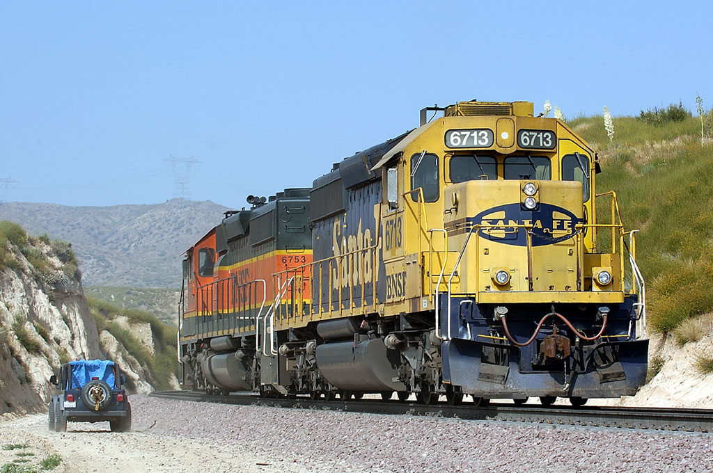 サミットに向かうヘルパー重連の 回送です。SD40-2といえども、隣のジープにくらべると何と大きいことでしょう! BNSF 6713 + BNSF 6753 |