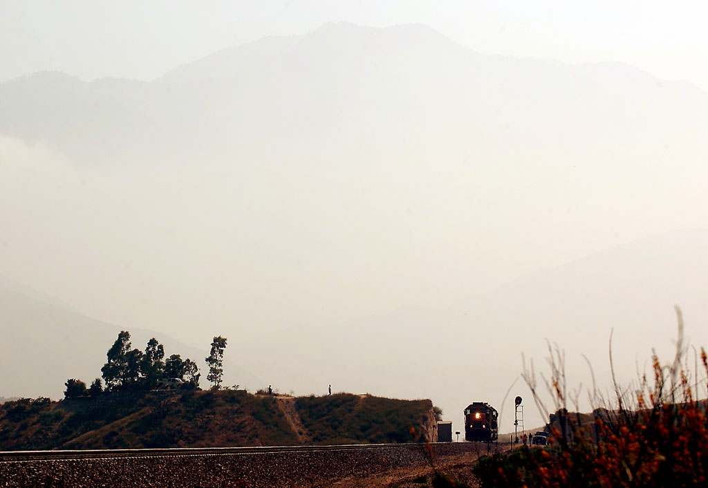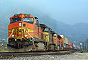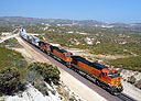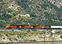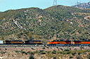 Pass 2001に掲載した次の画像(長らくMy Rail Diaryのトップ画像にしていました)とほぼ同じ位置から撮ったものです。残照を受けて4重連が峠に挑みます。BNSFの列車ですが、2両目のユニットはCSXのAV4400CWですね。この日最後の撮影でした。時刻は18時半。このあとショッピングセンターに寄って夕食と買い物をすませ、ロングビーチのホテルに向かいました。 BNSF 4679他 |