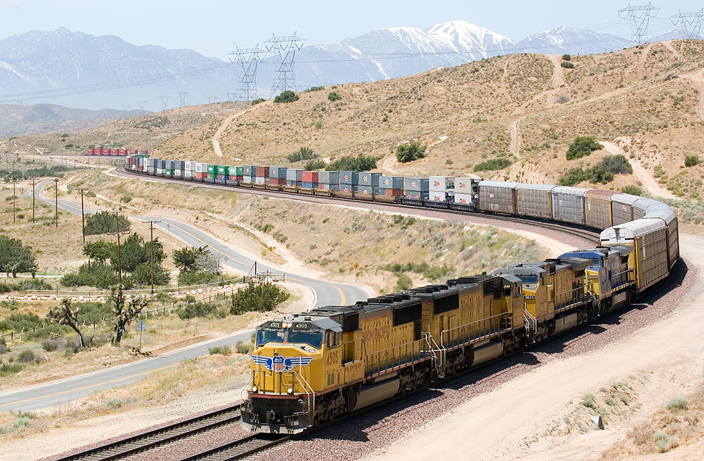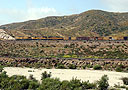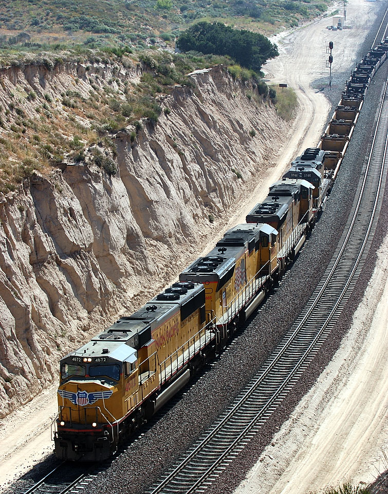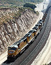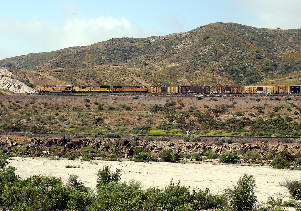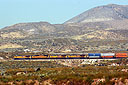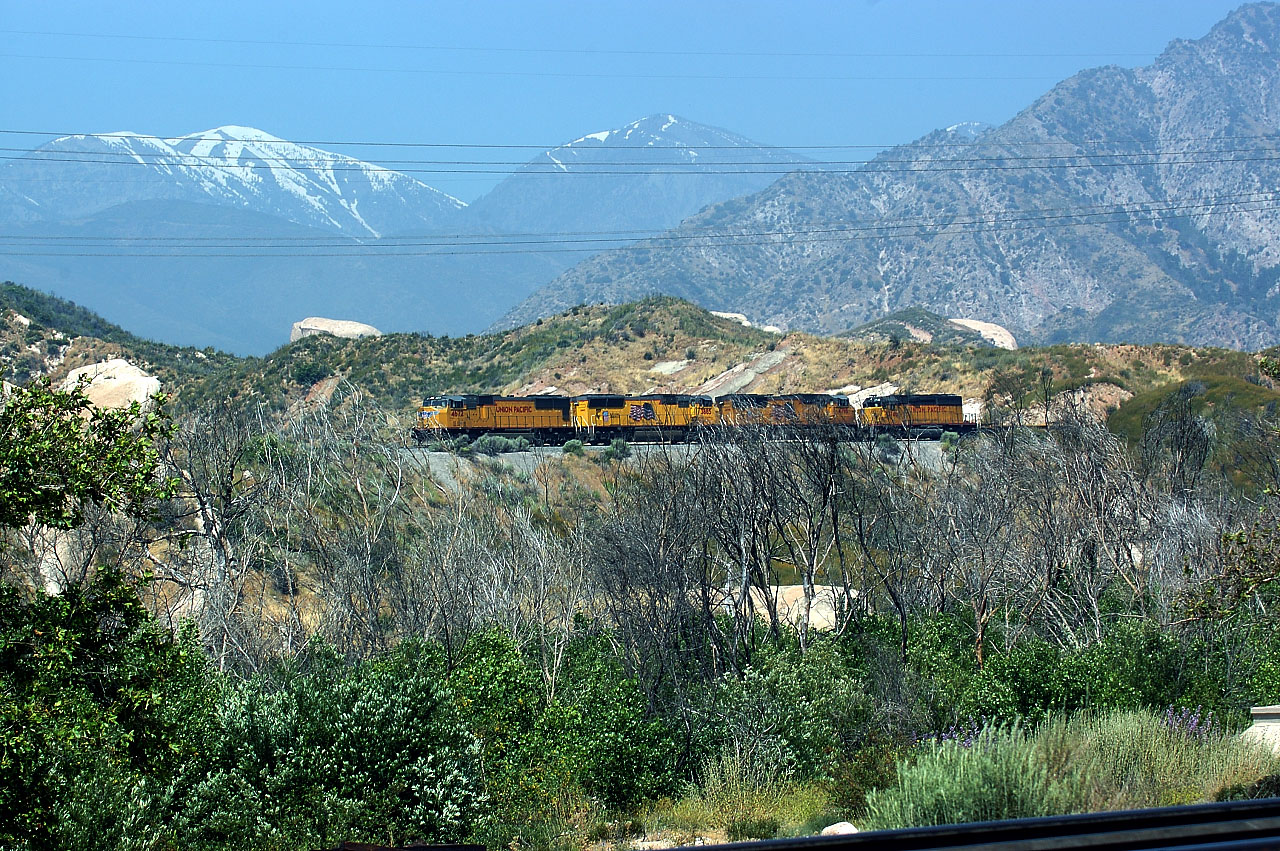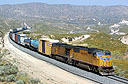 ほどなくサミット方向にUPのマニフェストが見えました。この撮影位置まで息をぜいぜい切らせて走りました。その間、安全には充分注意しましたが、落し物をしてしまいました。なんとそれがスキャナ! 撮影後、ずいぶんブッシュの中を探しましたが見つかりませんでした。ショック・・・・ しかしこの写真そのものは列車がCajonの景色によく溶け込んで、3本のトラックが並んでいる様子もよくわかり、気に入った1枚になりました。 UP 4102 (SD70M) + UP 9565 (C44-9W) |