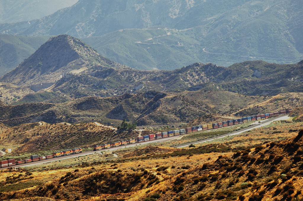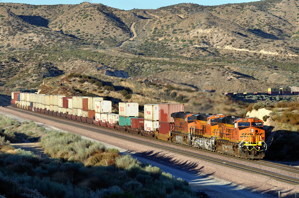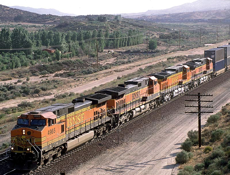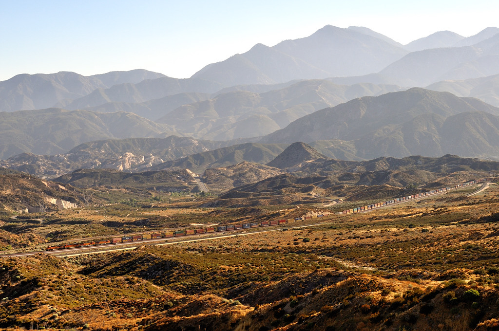 ![]() 自分には新しいアングルを見つけ、側面に陽が当たるまで待ちました(ホントは暑かっただけ?)。 そこへBNSFの5重連と3重連が行き交います。毎度ながらbusyな峠です。夕刻に差し掛かりラッシュを迎えたようです。考えてみると、以前はここにBNSFのトラックは1つしかなかったので、交換シーンは見られなかったはずです。その意味でも新しいアングルと瞬間になりました。 |