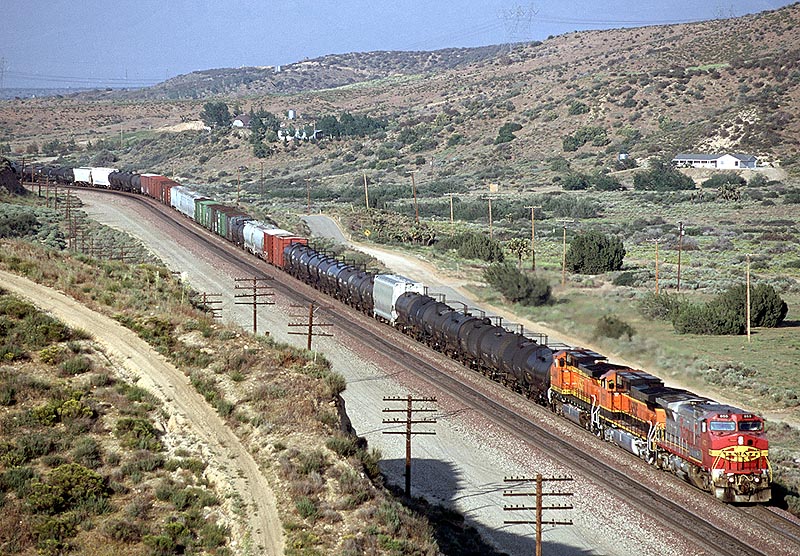 ![]() そこで、2001年、はじめてのCajon訪問を締めくくったSummit Valley Road近くからの俯瞰へ。きょうも良い天気でいいひかりです。さっそくJ.B. HUNTのダブルスタックがヤマを下ってきます。WarBonnetはもう居ませんが、懐かしさと、列車とひかりの巡りあわせの良さに、気分は最高潮です。 ※RailPictures.Net掲載 |