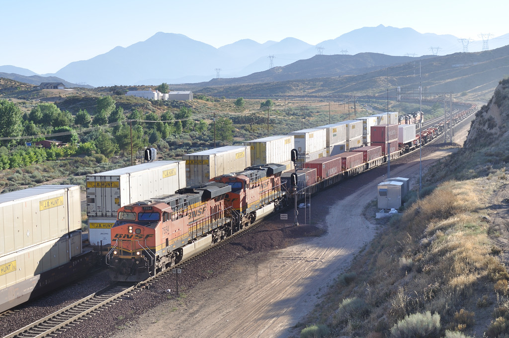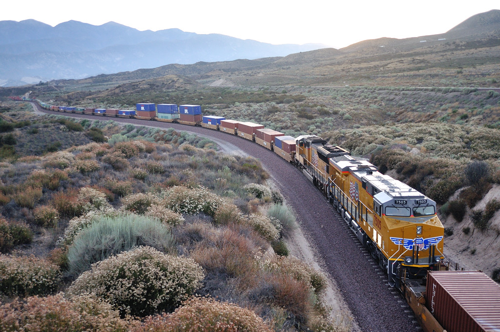 ![]() まだ陽の射すSilverwood方向に移動したら、西行きがMain2を登ってきました。ただ、このトラックにはもう陽が当たりませんでした。なので流してみます。2005年、パワーバー塗装に驚いた新車のES44DCも、すっかり峠に馴染んでいます。 ※ほぼ同一アングルの7752がCajonPass2005にありました。 |