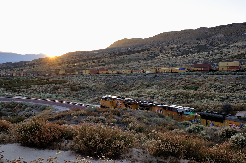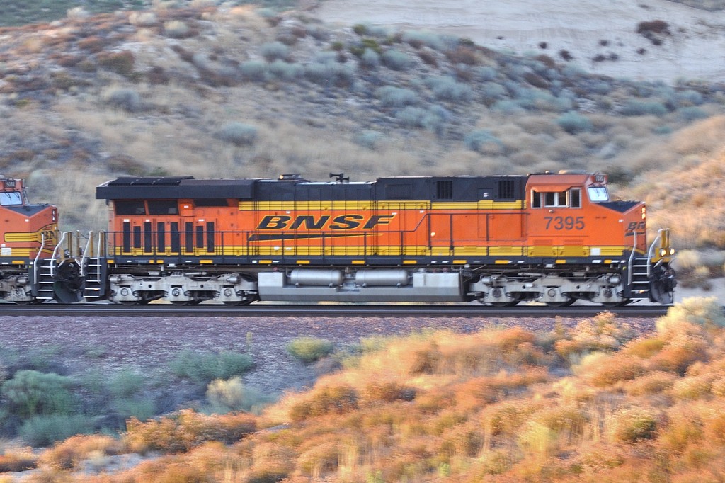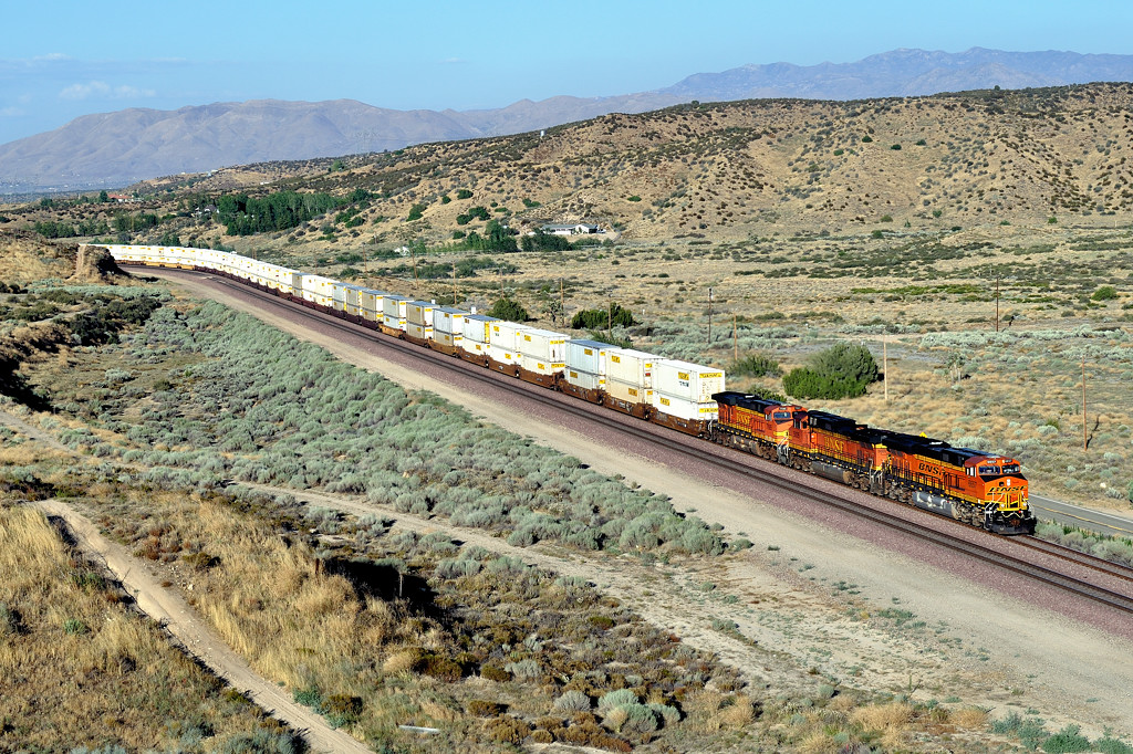 ![]() これが当初期待した決まりアングルです。列車のストレッチ感は素晴らしいです。ただBNSFのオレンジ塗装が周囲の土色に同化し、あまり機関車が目立ちません。それで、一つ上の写真がお気に入りに浮上しました。 いずれにしても、この列車の迫力と光と陰に満たされ、別の場所で別の雄姿を求めたくなりました。 |