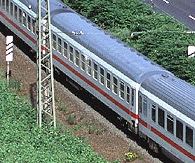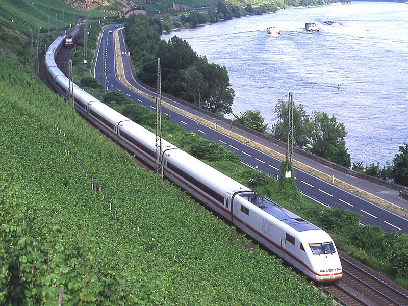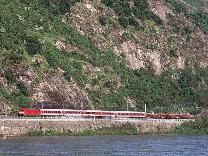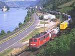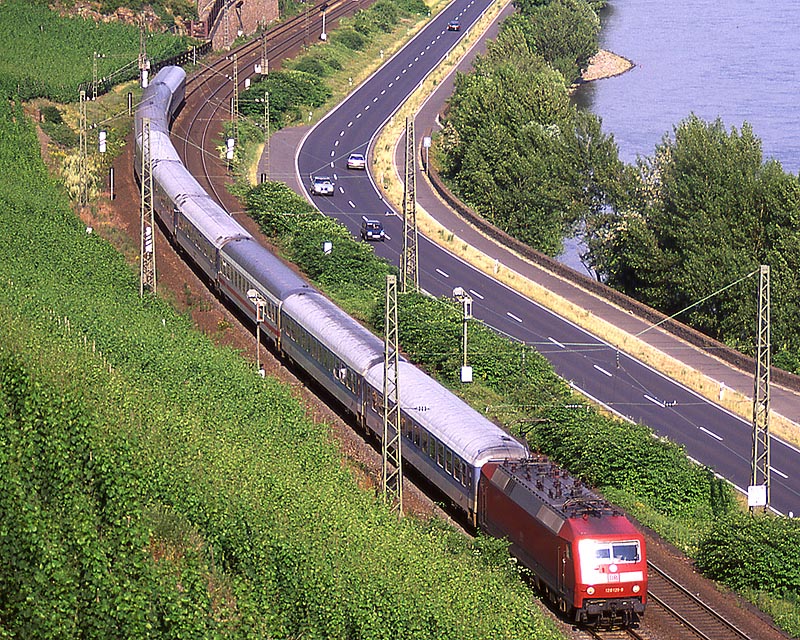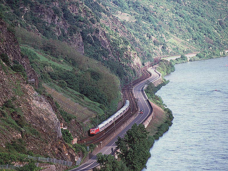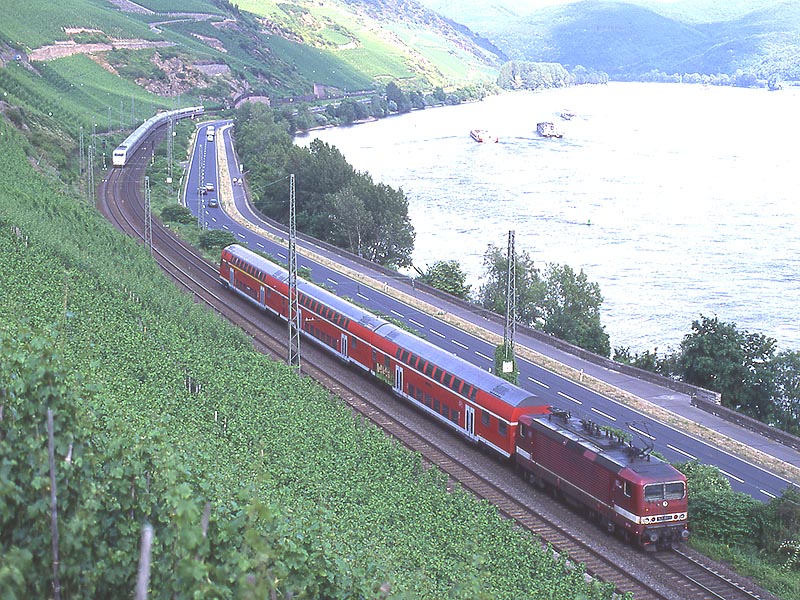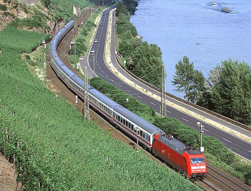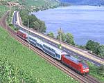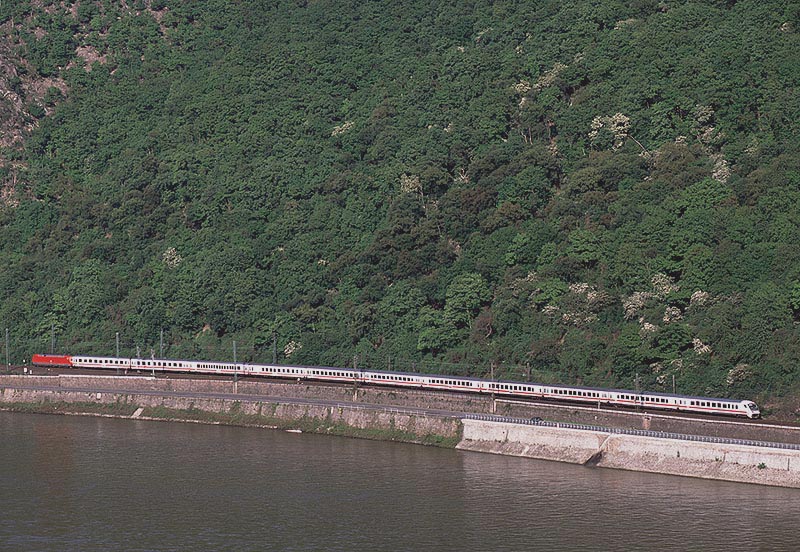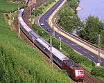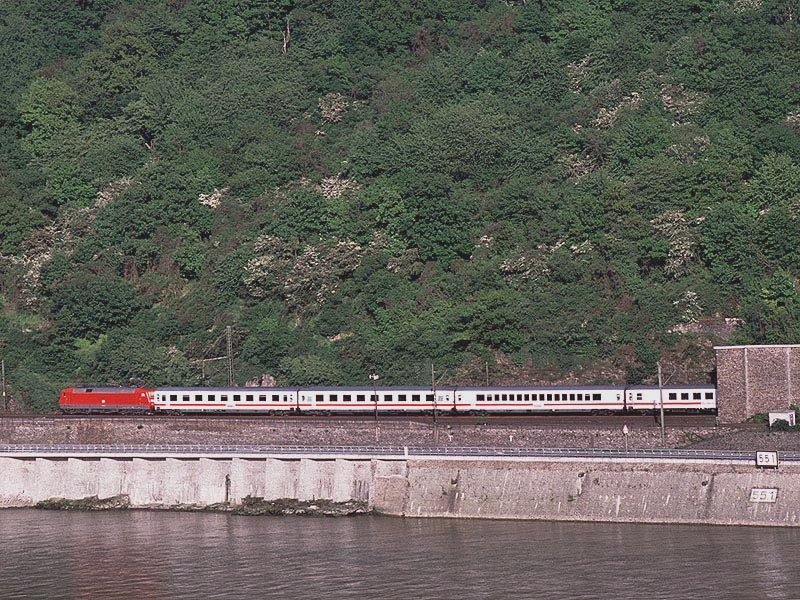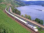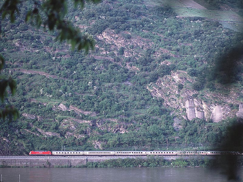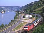 この8月にはケルン〜フランクフルトの高速新線に一部の営業列車が走りはじめ,12月には本格的に高速新線が使用される予定になっています.その日には,この美しいライン渓谷からICE, EC, IC, IRなどの長距離列車はほとんど全て姿を消すことになります.その直前の時期に訪問チャンスを得たことはまさにラッキーでした. また実際に訪問してみると,驚くべきことに右岸線を長距離列車が次々と通過してゆきました.ご承知のように,ライン川には右岸と左岸のそれぞれに沿って鉄道が敷かれています.左岸線は「特急街道」で列車密度が高く,その一方で右岸線はローカル列車と貨物列車が主役です.ローカルなはずの右岸線を長距離列車が続々と通過するというのは,ふつうは考えられないことです. いろいろな方に教えて頂いたところ,いま左岸線から右岸線への継続的な迂回措置が取られており,長距離列車の約半数が迂回対象になっています.これは7月中旬まで続く予定だそうです.何でも,2002年2月に左岸線のSt. Goar付近で大規模な土砂崩れが起き,その復旧工事のため左岸線ではSt. Goar-間で単線運転が行われているそうです.列車回数の多い左岸線では線路容量が不足するというのが右岸線への迂回の理由だそうです.一日も早く復旧するといいですね. その一方で,列車撮影の上ではまたとない機会にライン渓谷を訪れました.つまり「特急街道」として最後の時期に訪問できたことと,右岸に長距離列車が走る期間に訪問できたという,2つのラッキーが重なりました.さてその幸運を生かすような写真は撮れたでしょうか? (Ver. 1.2, May 25, 2003 のコメント) |