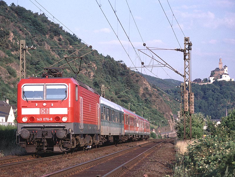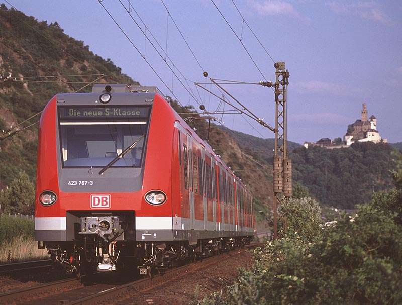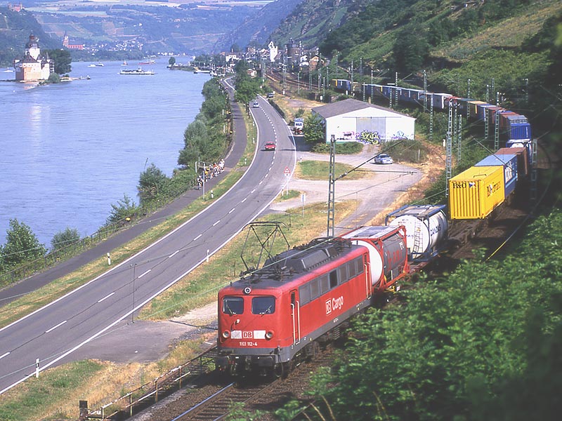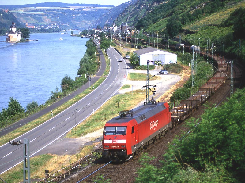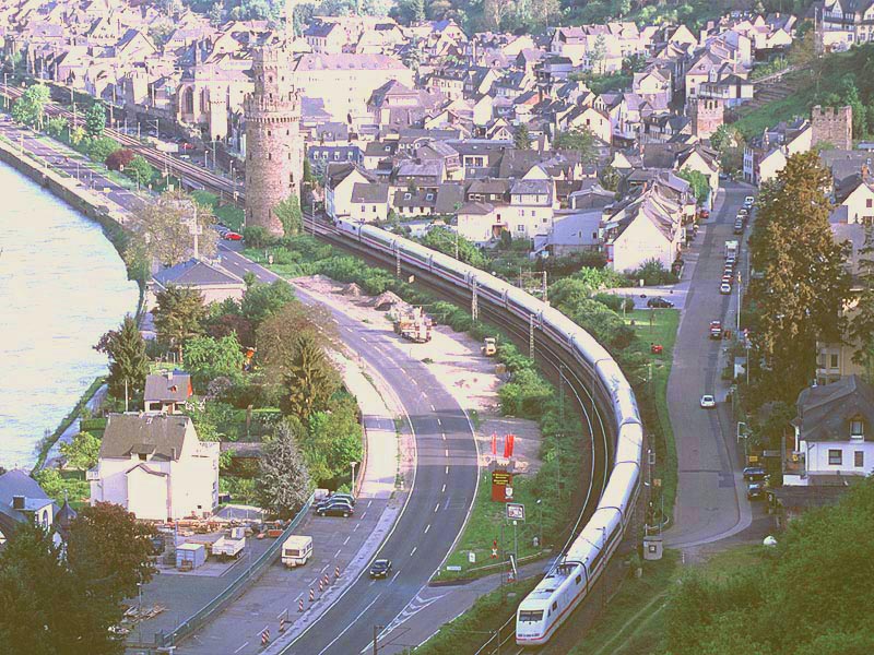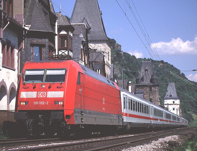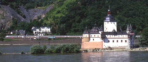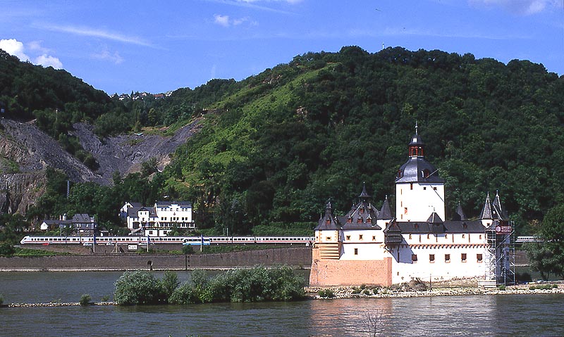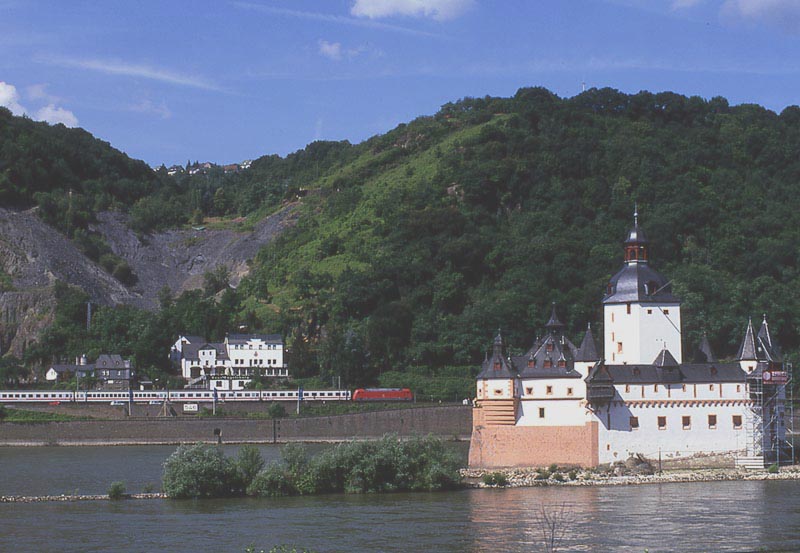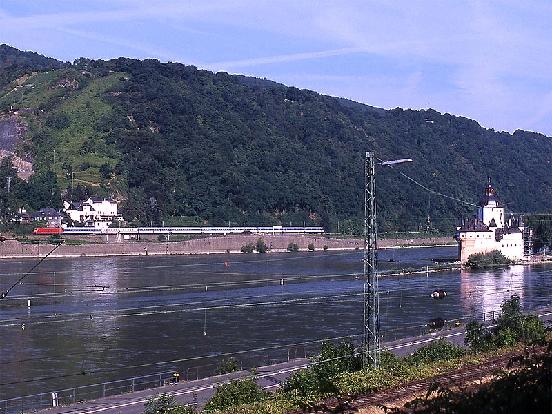 いよいよライン川に沿う区間に出ました.ここカウブは右岸の撮影地として知られたところのようです.私はドイツの鉄道雑誌で「ICがライン右岸線に迂回」という記事に添えられた写真でカウブを知りました.ライン川中洲の城として知られるプファルツ城の目の前に駅があります.そういえば,1999年に初めてライン川を訪れた時,駅に停車した列車の窓からプファルツ城を撮ったことがありました.それがカウブ駅だったはずですね. 実はカウブを訪問したのは,この旅の一番最後でした.朝7時前にケルンを出発してカウブで2時間ほど撮影し,フランクフルト空港へ移動してそのまま帰国したのでした.その前日はオランダで仕事がありましたので,ふつうならそのままオランダに宿泊し,アムステルダム空港からフランクフルト経由で帰国するところでしょう.私はカウブで撮影するために陸路を選んだのでした.スーツケースがありましたので,ロッカーの有無の判らない小駅界隈で撮影するかどうか,前夜のホテルでかなり迷いましたが,えいやっと来てしまったところ駅事務室で快く荷物を預かってくださいました. |