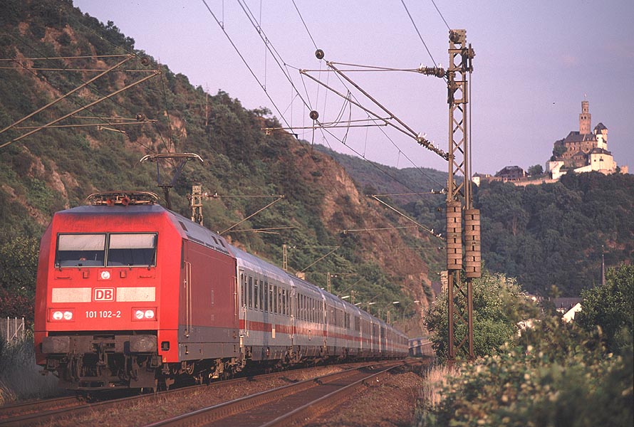時刻は午後6時半を回った.まだ日没まで3時間ある.右岸の北方面への列車が夕日に映える時間帯だ.何度も道に迷いながらBraubachに19:40頃到着.ドイツの町並をバックをにした写真を撮れないかと場所を探したが,偶然,古城マルクスブルグをバックに列車を撮れそうな場所に出た.ここが気に入ったので,ICが来るまで粘ることにした. |