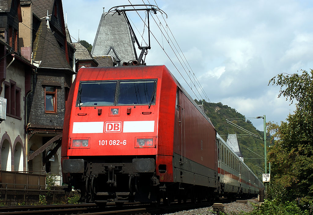 悔しいのでいましばらくここで撮影を続けることにしました.実はここで2,3本凡ミスが続き,列車の後尾が切れたり,手前のパンタの先端が途切れた構図になったりと,集中力を欠くこと仕切りでした.ここ2日ほど4時間づつしか寝ていないので,まぁ仕方ないかと気を取り直してこのICに臨みました.機関車がプッシュでgoodな列車です.パンタは後尾が上がってフレームアウトしやすいですが,うまく撮れました. 101 082-6, St. Goar-Bachrach |