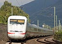 3分後,お目当てのICE1が登場.予想外に長い編成で13両でしょうか.後尾がうまく画面に収まったのはラッキーでした.9号線の道路標識は期待通り列車の陰に隠れ,またバックの山が画面を引き締めてくれています.お気に入りです(笑). ICE1, Trechtingshausen - Niederheimbach |